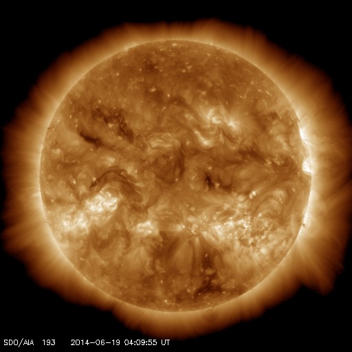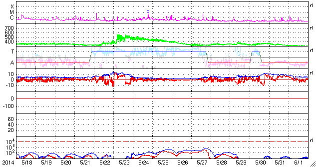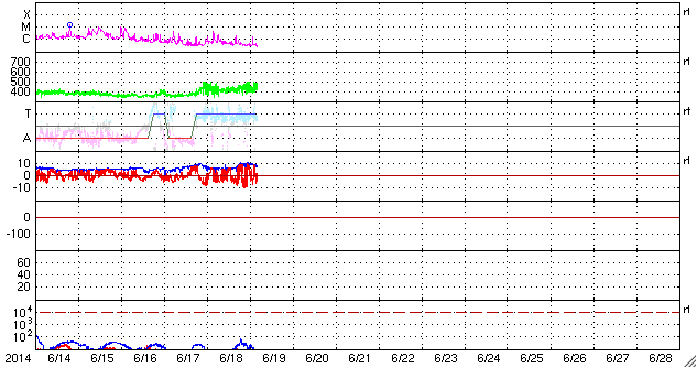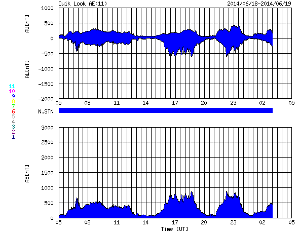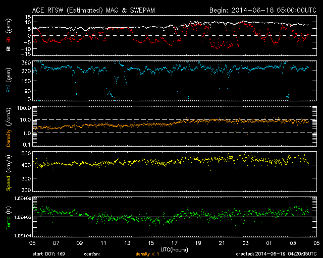 2014/ 6/19 13:20 更新 担当 篠原 太陽風の速度は、昨日のニュースの後に、 400km/秒近くまで下がりましたが、 今日に入った頃からまた少し高まって、 現在は450km/秒とやや高速です。 磁場強度も同様で、5nTの状態から、 今日の未明に10nT近くまで高まる変化をして、 現在は7nTくらいです。 再び、太陽風速度の弱い高まりの領域に入ってきた様です。 磁場の南北成分は、数時間おきに南北に振れています。 このため、磁気圏の活動も数時間おきに高まって、 AE指数では、500nTや800nTの山が 時間をおいて発生しています。 南極の昭和基地ではオーロラの輝きが見えていた様ですが、 天候が悪く、雲越しにオーロラの光が写っています。 太陽は、黒点はあちこちに見えていますが、 規模はどれも小さくなり、 活動もだいぶ穏やかになっています。 フレアは、昨日の昼、18日12時(世界時18日3時)に、 南西の2087黒点群で発生したC4.0が最大で、 その他に、C1やC2の小さいフレアが 5回ほど発生した程度です。 2087群も次第に西の端に近づいて、 残るのは2093群と2094群となるのでしょうか。 ![]() SDO衛星のAIA193カメラによる太陽コロナの様子 (c) SDO (NASA) ![]() SDO衛星による太陽の可視光写真。マウスの矢印を写真に重ねると、黒点番号付きの写真に切り替わります。 (c) SDO (NASA) ![]() ACEが観測した太陽風の磁場(1番上の枠、白線は全体の強度、赤線は南北成分) および、太陽風の密度(3番目の橙線)、速度(4番目の黄線) (c) NOAA/SWPC ![]() リアルタイムAE指数 下段のAEグラフの値が高くなると、オーロラ活動が活発化しています。 (c) 京都大学, NICT ![]() 27日の太陽周期に合わせたデータプロット 太陽が同じ面を地球に向けていた27日前の変化から、今後を予想することができます。 (c) 作図:宇宙天気ニュース