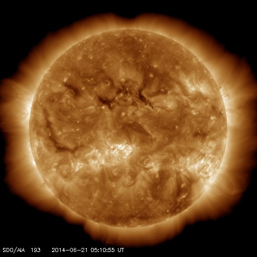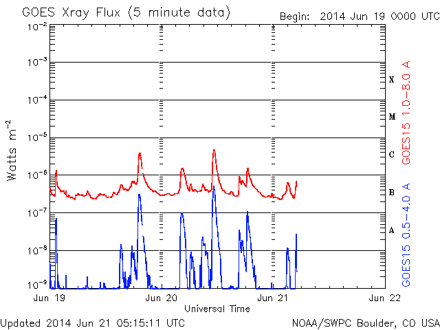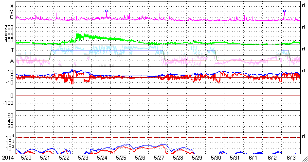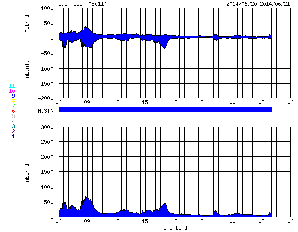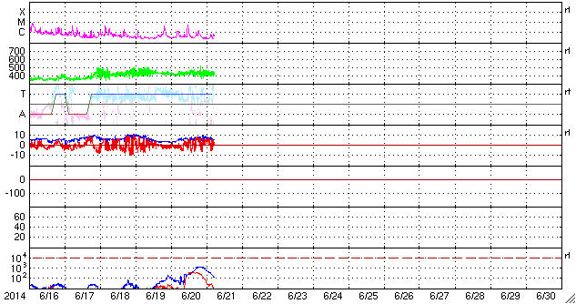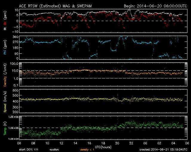 2014/ 6/21 14:19 更新 太陽風は420km/秒で安定しています。Cクラスのフレアが数回起きています。 担当 篠原 太陽風は、420km/秒と平均的な速度が続いています。 磁場強度は、5nTと10nTの間を増減していて、 少し強まっています。 磁場の南北成分は、北寄りの時間帯が長く、 時々南向きに振れています。 そのため、磁気圏でも時々活動が発生していて、 AE指数には、500nTくらいの山が2回ほど記録されています。 穏やかな太陽風が続いていますが、 27日周期の図を参考にすると、 明日以降は速度が下がり、低速風に変わるかもしれません。 太陽は、中央部の2093黒点群で、 C5.0と少し大きいCクラスフレアが発生しています。 この他には、C1の小さいフレアが3回ほど起きています。 また、つい先ほど、21日13時半(世界時21日4時半)頃に、 太陽の中央付近でフィラメント噴出が起きています。 CMEの様子など、詳細は明日お知らせできると思います。 地球からは正面に当たるので、 3〜4日後くらいに太陽風の乱れが発生しそうです。 速度の変化は小さいと思われますが、 磁場の強まりが流れてくる可能性があります。