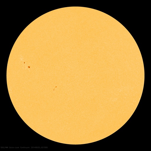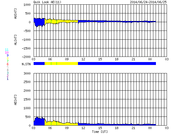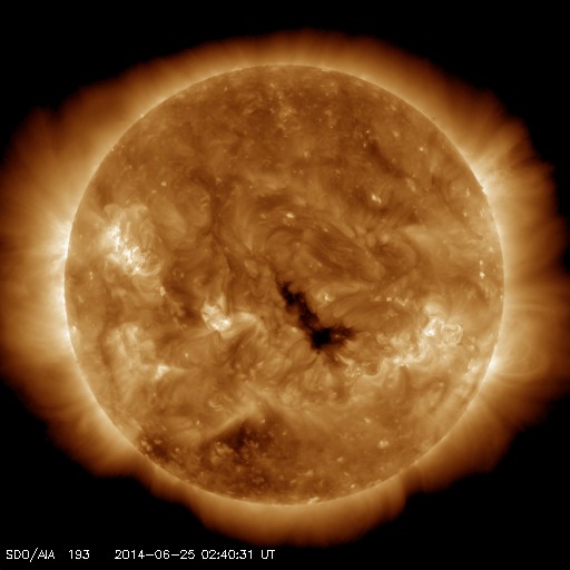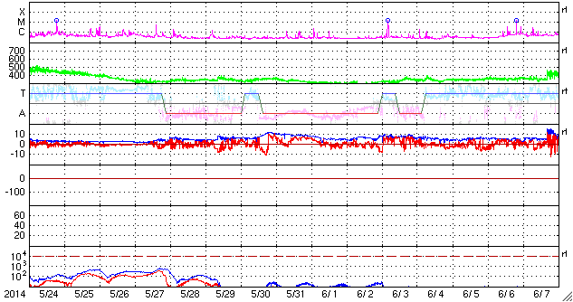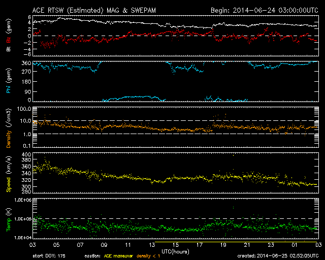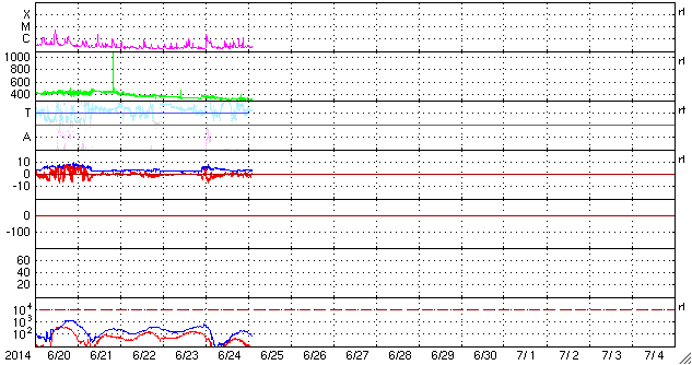2014/ 6/25 11:52 更新 太陽風はかなり速度が遅くなっています。太陽も穏やかです。 担当 篠原 太陽風の速度は、360km/秒から310km/秒へ下がり、 太陽風はかなり遅くなっています。 磁場強度は、3〜4nTで安定しています。 磁場の南北成分の変化も小さくなり、 いくらか南寄りだったグラフの前半に対応して、 AE指数も前半に小さい変化が起きていますが、 中盤以降はほとんど変化していません。 SDO衛星AIA193を見ると、 太陽の中心付近に小さいコロナホールがあります。 3日後くらいにこの領域の影響がいくらか及ぶかもしれません。 前周期にはなかったコロナホールなので、 太陽風も前周期とは違う変化が見られるかもしれません。 太陽は、南西に沈んだ2092黒点群で C2の小規模フレアが発生しましたが、 太陽のこちら側の黒点群では、 2096群でBクラスの小さい活動が起きた程度です。 また、太陽の東端の向こう側に、 ある程度活動的な領域があるようです。 明日くらいに見えてくるかもしれません。
