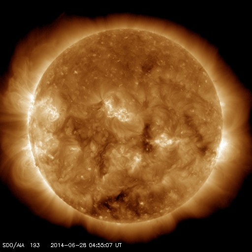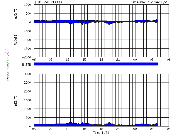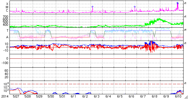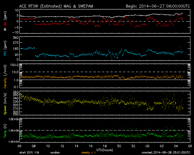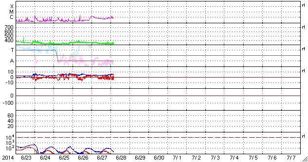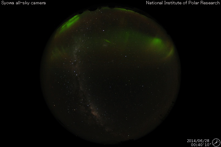 2014/ 6/28 14:01 更新 太陽風は300km/秒近くまで低速になっています。 担当 篠原 太陽風の速度は320km/秒へ下がり、一段と低速になっています。 磁場強度は、4nTから5nTヘ小さく変化している程度で、 安定しています。 磁場の南北成分は、 振れ幅は小さいですが頻繁に南向きに振れています。 このため、磁気圏でも小規模の活動が起きている様で、 AE指数には小さい変化が所々に見えています。 また、昭和基地の全天カメラでも オーロラの活動が撮影されています。 1枚目に動画を掲載します。 太陽風は、このまま穏やかな状態が続きそうです。 太陽は、黒点は小さいものばかりになっていますが、 東端から活動的な領域が近づいていて、 X線のグラフの値が少し高くなっています。 C1の小さいフレアも起きている様で、 今後の活動に注目して下さい。 ![]() 南極の昭和基地で、全天カメラにより撮影された世界時28日1時頃のオーロラ。 (c) 国立極地研究所、(動画加工 : 宇宙天気ニュース) ![]() SDO衛星のAIA193カメラによる太陽コロナの様子 (c) SDO (NASA) ![]() SDO衛星による太陽の可視光写真。マウスの矢印を写真に重ねると、黒点番号付きの写真に切り替わります。 (c) SDO (NASA) ![]() ACEが観測した太陽風の磁場(1番上の枠、白線は全体の強度、赤線は南北成分) および、太陽風の密度(3番目の橙線)、速度(4番目の黄線) (c) NOAA/SWPC ![]() リアルタイムAE指数 下段のAEグラフの値が高くなると、オーロラ活動が活発化しています。 (c) 京都大学, NICT ![]() 27日の太陽周期に合わせたデータプロット 太陽が同じ面を地球に向けていた27日前の変化から、今後を予想することができます。 (c) 作図:宇宙天気ニュース
