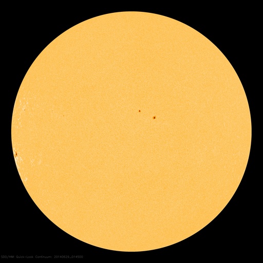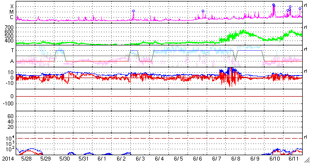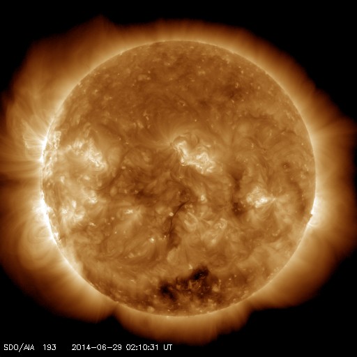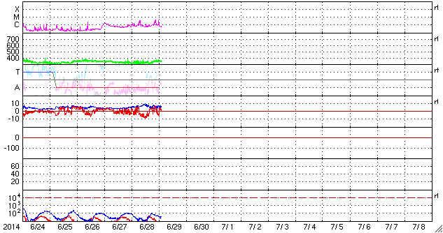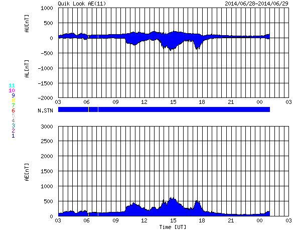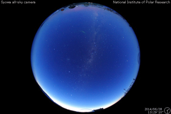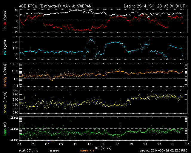 2014/ 6/29 11:23 更新 太陽風は低速です。太陽の東端でCクラスのフレアが増えています。 担当 篠原 太陽風の速度は、 320km/秒から350km/秒へ少しだけ変化していますが、 低速の状態が続いています。 磁場強度は少し強まって、7nT前後で変化する様になっています。 27日周期の図を見ると、6月3〜4日に同様の小さい変化があり、 セクターの切り替わりにつながっています。 今回もこの変化が回帰しているのかもしれません。 磁場の南北成分は、南北にゆっくりと変化しています。 磁場強度が少し強まったため、振れ幅も少し大きくなり、 -5nTを超える南向きにもなっています。 この影響で磁気圏の活動もより大きくなっていて、 AE指数は400〜600nTの変化が発生しています。 この変化の一部にあたる時間帯の、 南極の昭和基地の全天カメラの動画を掲載します。 日没後の夕暮れの空が次第に暗くなり (天の川も一緒に写っているので、淡い薄明程度だと思います)、 やがて、高緯度側の低空にオーロラの光が見え始めます。 空を覆う様な活動ではありませんが、良い雰囲気の夜空です。 太陽では、東端から活動的な領域がやってきて、 Cクラスの小規模フレアを頻繁に起こしています。 C4.2、C3.4などを最大に、 10回近くCクラスのフレアが発生しています。 可視光写真では、東端から黒点が姿を現しています。 この領域の今後の活動に注目して下さい。 ![]() 南極、昭和基地の全天カメラによる、世界時24日14時頃の夕暮れとオーロラ。 (c) 国立極地研究所、(動画加工 : 宇宙天気ニュース) ![]() SDO衛星のAIA193カメラによる太陽コロナの様子 (c) SDO (NASA) ![]() SDO衛星による太陽の可視光写真。マウスの矢印を写真に重ねると、黒点番号付きの写真に切り替わります。 (c) SDO (NASA) ![]() ACEが観測した太陽風の磁場(1番上の枠、白線は全体の強度、赤線は南北成分) および、太陽風の密度(3番目の橙線)、速度(4番目の黄線) (c) NOAA/SWPC ![]() リアルタイムAE指数 下段のAEグラフの値が高くなると、オーロラ活動が活発化しています。 (c) 京都大学, NICT ![]() 27日の太陽周期に合わせたデータプロット 太陽が同じ面を地球に向けていた27日前の変化から、今後を予想することができます。 (c) 作図:宇宙天気ニュース
