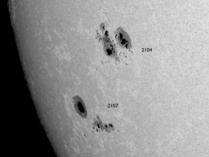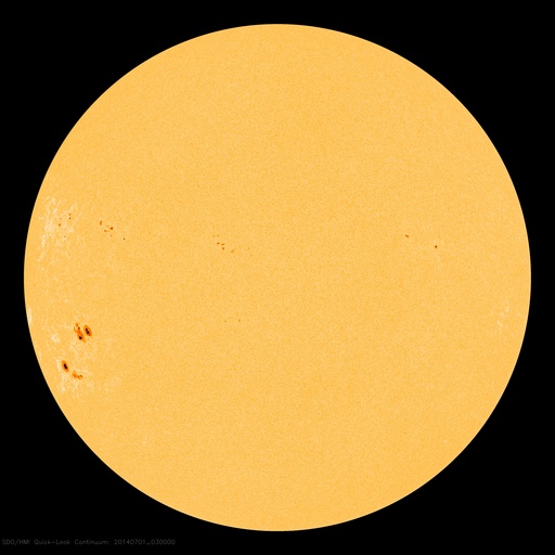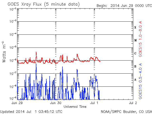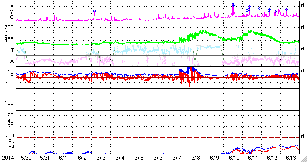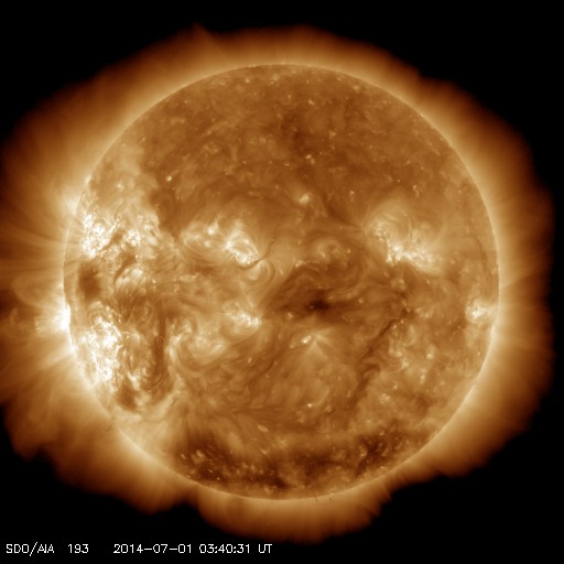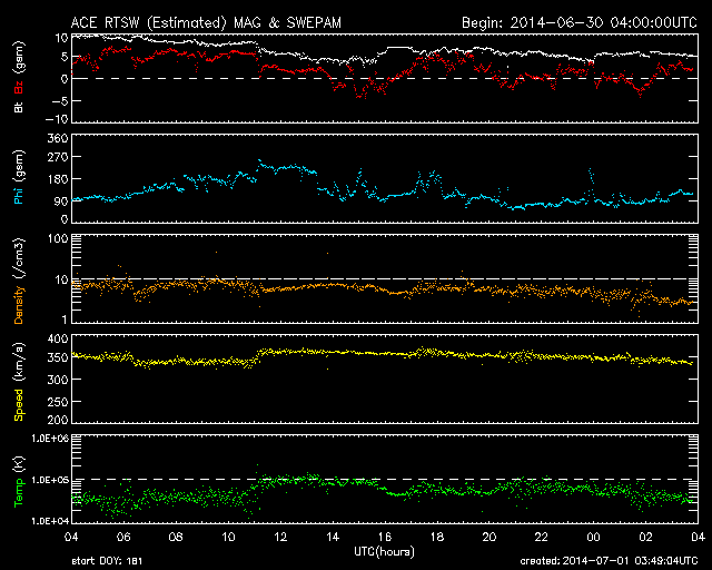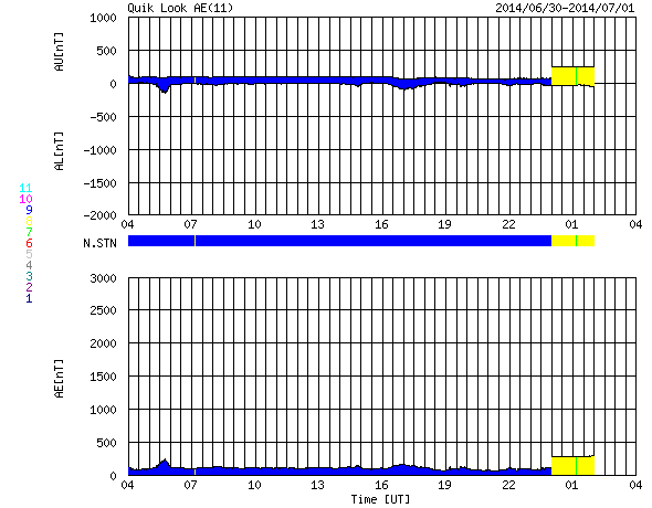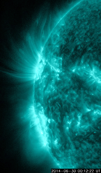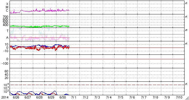 2014/ 7/ 1 12:49 更新 太陽の東端で小さい活動が目立っています。太陽風は低速で、磁気圏は静穏です。 担当 篠原 太陽の南東側(左下)で、 2104黒点群と2107黒点群が大きく目立っています。 SDO衛星による拡大写真を1枚目に掲載します。 この領域と、北側の2106群では、 規模は最大でC2〜3と小さいものの、 SDO衛星の動画を見ると、 活発に小さい活動が起きています。 今後、フレアの規模が大きくなるようだと 注意が必要になるでしょう。 太陽風の速度は、 350km/秒付近で小さく変化する程度で、 低速の風が続いています。 磁場強度も5nTと平均的な値に下がり、落ち着いています。 磁場の南北成分は、小さく南北に振れていますが、 どちらかというと北寄りで、 磁気圏の活動は弱まり、 AE指数はほとんど変化していません。 27日周期の図を見ると、 太陽風磁場のセクターの切り替わりは到来せず、 そのまま「A」の状態が続いています。 SDO衛星AIA193では、 南半球の高緯度域に広いコロナホールが見られる程度で、 穏やかな太陽風はこのまま続きそうです。