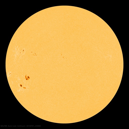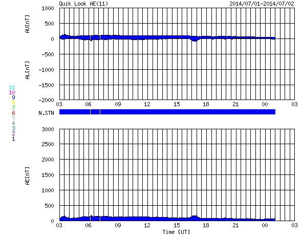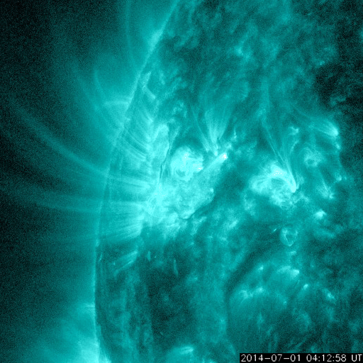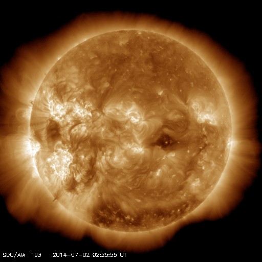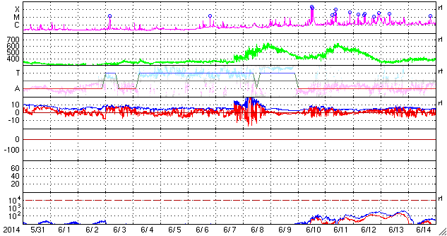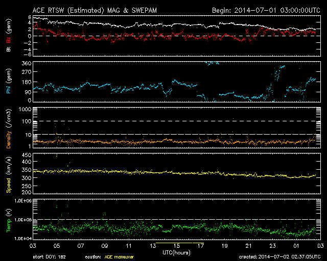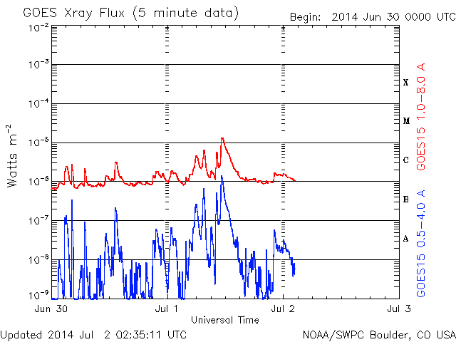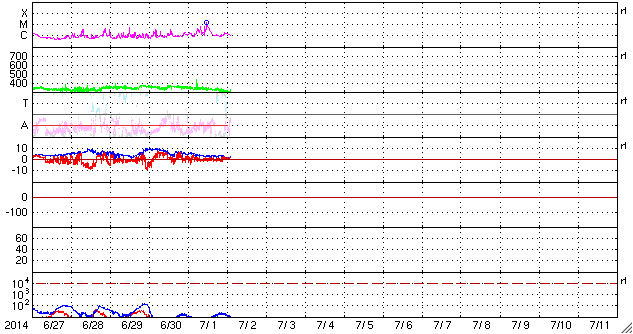 2014/ 7/ 2 11:38 更新 太陽の東側でM1の中規模フレアが発生しました。太陽風は一段と低速です。 担当 篠原 太陽の北東部(左上)の1406黒点群の活動が強まっています。 昨夜は、1日20時(世界時1日11時)にM1.4の中規模フレアが発生し、 その前にも、C4.8、C6.0を起こしています。 Mクラスのフレアの発生は、 6月15日のM1.0以来、半月ぶりです。 これらのフレアの様子を、 SDO衛星AIA131による動画で紹介します。 太陽では、南東(左下)の2107群でも、 C6.6とやや大きいCクラスフレアが起きています。 太陽の東端からは、更に2108黒点群も姿を現し、 GOES衛星のX線カメラの動画を見ると、 太陽の東側はにぎやかに活動しています。 この後もフレアの発生が続きそうです。 太陽風は、昨日からゆっくりと速度が低下して、 現在は300km/秒と更に遅い風になっています。 磁場強度も5nTから2nTに下がっています。 磁気圏はとても穏やかで、 AE指数はほとんど変化していません。 穏やかな太陽風はこのまま続きそうです。