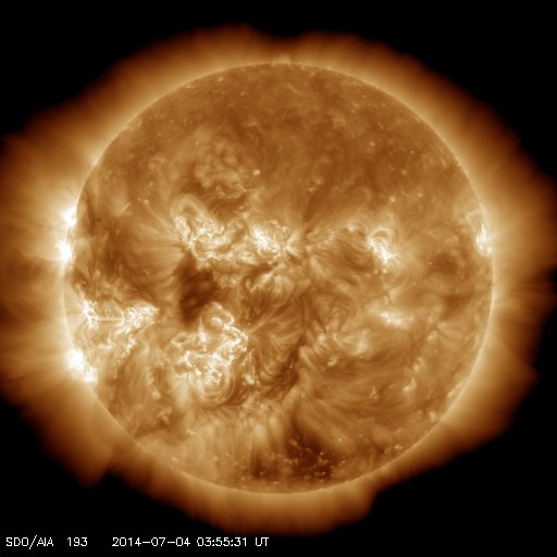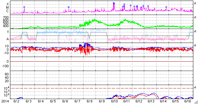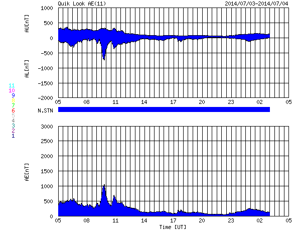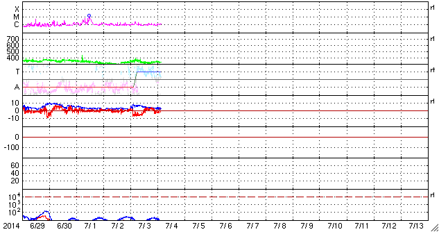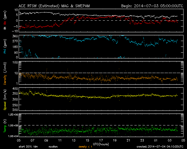 2014/ 7/ 4 13:10 更新 太陽風磁場の影響でオーロラが強まりました。カナダのオーロラをどうぞ。 担当 篠原 昨日の太陽風磁場の南向きは、 3日20時(世界時3日11時)頃まで-5nTの状態が続きました。 速度は350km/秒程度と比較的低速でした。 この太陽風変動の影響で、磁気圏の活動が高まり、 AE指数を見ると、500nTから、 最大1000nTに達する大きい変化も記録されています。 このオーロラ活動の様子が、 カナダの高坂雄一さんより届きました。 この夜、カナダ南西部ブリティッシュコロンビア州の内陸の レベルストーク付近でキャンプしていたところ(1枚目の写真)、 雷、大雨とたいへんだったそうですが、夜半から晴れて、 中緯度オーロラを見ることができたそうです。 2、3枚目にオーロラの写真を掲載します。 オーロラ帯と比べると、緯度が低い場所なので、 地平線近くの低い空にオーロラが見えています。 時差を考えると、AE指数が大きく変化した頃のオーロラを 見ることができたのではないでしょうか。 オーロラのすぐ上に北斗七星が輝き、 更にその上には夏の天の川が見えています。 勝手な思い込みですが、 夏の天の川とオーロラが並ぶのはとても不思議な感じです。 高坂さんにとっても、今回のオーロラは思わぬ出現だったそうです。 きれいな写真をありがとうございました。 現在の太陽風は、速度は330km/秒、磁場強度は4nTと、 昨日から始まった変化は終わっている様です。 磁場の南北成分は、0nT付近で小さく変化していて、 磁気圏の活動も弱まっています。 太陽は、東端の2109群も大きな姿を現して、 2104、2107群とともににぎやかになっているのですが、 フレアの活動はおとなしくなって、 C2.6とC1.9の小規模フレアが発生した程度です。 引き続き様子を見て下さい。 ![]() カナダBC州レベルストークの高坂さんのキャンプの様子。 (c) 高坂雄一氏 ![]() カナダBC州レベルストークで、現地2〜3日の夜に撮影されたオーロラ。 (c) 高坂雄一氏 ![]() カナダBC州レベルストークで、現地2〜3日の夜に撮影されたオーロラ。 (c) 高坂雄一氏 ![]() SDO衛星のAIA193カメラによる太陽コロナの様子 (c) SDO (NASA) ![]() SDO衛星による太陽の可視光写真。マウスの矢印を写真に重ねると、黒点番号付きの写真に切り替わります。 (c) SDO (NASA) ![]() ACEが観測した太陽風の磁場(1番上の枠、白線は全体の強度、赤線は南北成分) および、太陽風の密度(3番目の橙線)、速度(4番目の黄線) (c) NOAA/SWPC ![]() リアルタイムAE指数 下段のAEグラフの値が高くなると、オーロラ活動が活発化しています。 (c) 京都大学, NICT ![]() 27日の太陽周期に合わせたデータプロット 太陽が同じ面を地球に向けていた27日前の変化から、今後を予想することができます。 (c) 作図:宇宙天気ニュース