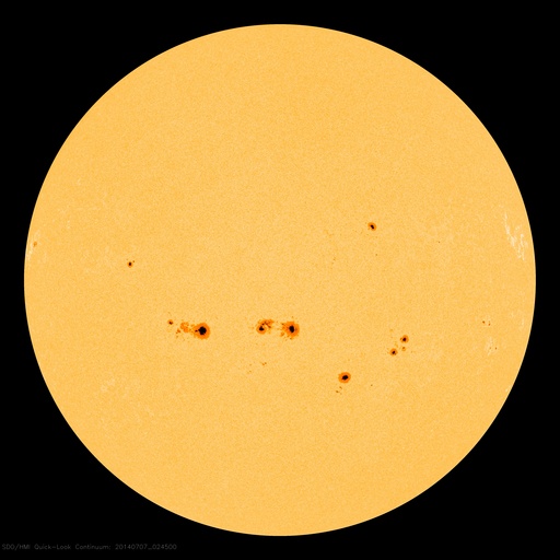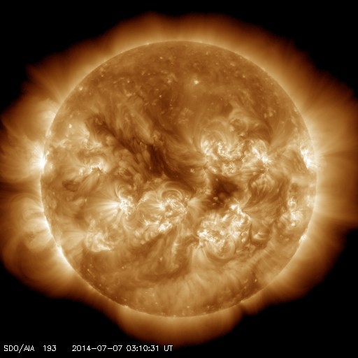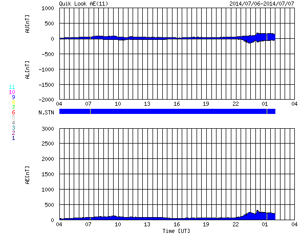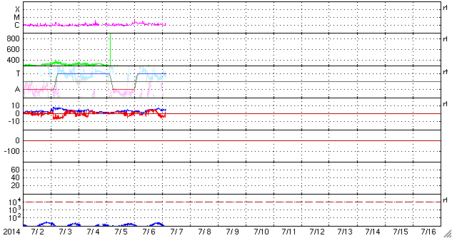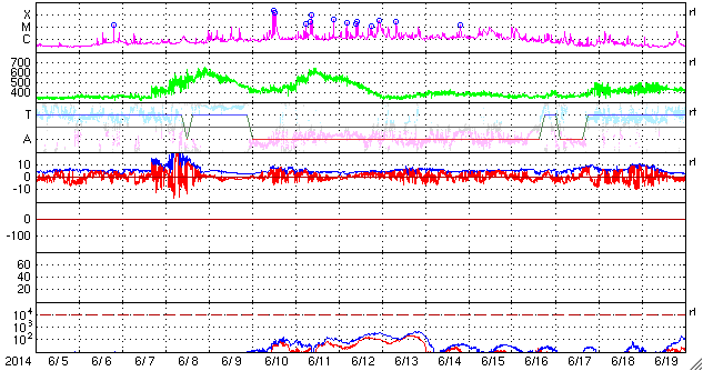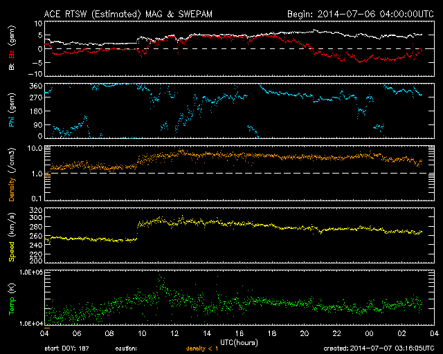 2014/ 7/ 7 12:16 更新 太陽風は200km/秒台後半のかなり遅い状態が続いています。太陽は比較的穏やかです。 担当 篠原 太陽風は、200km/秒台後半のとても遅い状態が続いています。 ACE衛星の観測によると、昨夜、6日19時(世界時6日10時)頃に、 太陽風に小さい変動が発生して、 速度が250km/秒から290km/秒へ少しだけ高まりましたが、 その後、速度はゆっくりと下がって、 現在は270km/秒とかなり遅い状態に戻っています。 磁場強度は、5nTと平均的な値に戻っています。 磁場の南北成分は、グラフの後半で -4nTと振幅は小さいですが、南向きに振れ続け、 磁気圏活動を多少高めています。 昭和基地で撮影されたオーロラの様子を掲載します。 高い領域の赤い光と低い領域の緑色の光が、 とても鮮やかに見えています。 とても速度の遅い太陽風は、どこまで続くでしょうか。 太陽は、南半球を中心に黒点が多数現れています。 フレアの発生は、2108群でC3.5、2109群でC2.9、 その他にC1のフレアが数回発生した程度で、 全体としてはあまり活動的ではありません。 一方、2108群と2109群は、 磁場の構造がより複雑になっているそうで、 フレアが増えてくる様だと注意が必要になるでしょう。