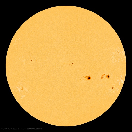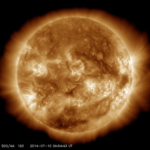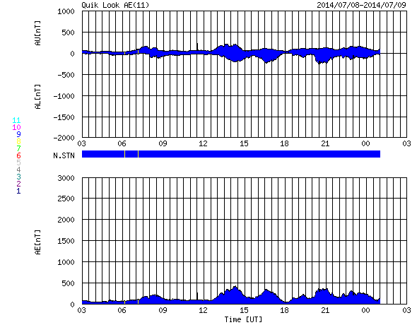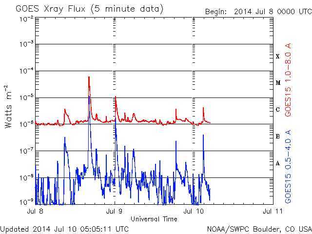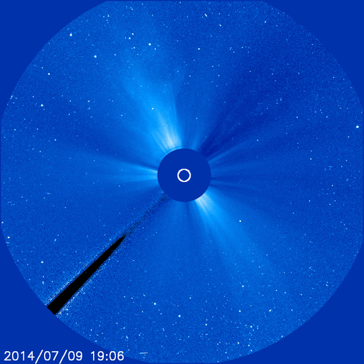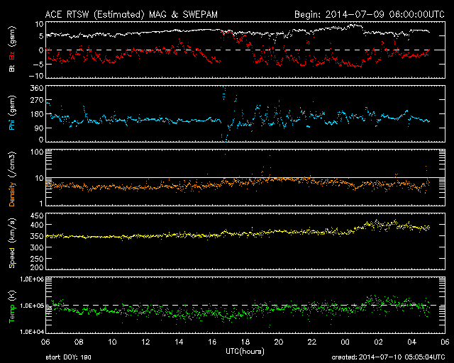 2014/ 7/10 14:30 更新 太陽でCMEが噴出しています。太陽風は380km/秒に少し上がっています。 担当 篠原 昨日お知らせした2つのMフレア以降、 2113黒点群では、C3.1、C2.7の 小規模フレアが発生した程度です。 一方、西の端に近づいた、 2104黒点群でC5.0、2106黒点群でC5.7と、 やや大きいCクラスのフレアが発生しています。 そして、10日3時(世界時9日18時)頃に、 太陽中央部の2111黒点群付近で 爆発現象が発生した様で、 SOHO衛星LASCO C3によるとCMEが噴出しています。 CMEは主に左上に向かっていますが、 発生地点を考えると、 地球へもある程度の太陽風の変化が やって来るかもしれません。 到来すると、3〜4日後の7月13〜14日頃でしょうか。 太陽風は、350km/秒から380km/秒へ少しあがり、 平均的な速度に戻っています。 磁場強度も5nTから7〜8nTに少し上がっていて、 速度がもう少し高まるかもしれません。 磁場の南北成分は、南向きの時間帯が長くなっています。 このため、磁気圏の活動も少し高まって、 AE指数は300〜400nTの小規模の変化が頻繁に起きています。 この後、太陽風がどのように推移するのか注目して下さい。 台風8号は、速度が遅かったために、 鹿児島へ上陸する前に弱まってしまい、 こちらでは、特別に強い風にも 強い雨にもなりませんでした。 現在は、雲は厚いですが、雨も風もなく静かです。 学校のLANが停止しているため、今日は手動更新で、 作業がたいへんでした。 ![]() 太陽から左上に向かって噴き出すCME。SOHO衛星LASCO C3。 (c) SOHO (ESA & NASA)、 (動画加工 : 宇宙天気ニュース) ![]() SDO衛星のAIA193カメラによる太陽コロナの様子 (c) SDO (NASA) ![]() SDO衛星による太陽の可視光写真。マウスの矢印を写真に重ねると、黒点番号付きの写真に切り替わります。 (c) SDO (NASA) ![]() GOES衛星の太陽X線データ (c) NOAA/SWPC ![]() ACEが観測した太陽風の磁場(1番上の枠、白線は全体の強度、赤線は南北成分) および、太陽風の密度(3番目の橙線)、速度(4番目の黄線) (c) NOAA/SWPC ![]() リアルタイムAE指数 下段のAEグラフの値が高くなると、オーロラ活動が活発化しています。 (c) 京都大学, NICT ![]() | ||||||||||||||||||||||||||||||||||||||||||||||