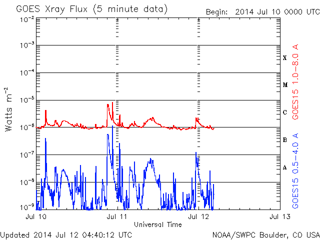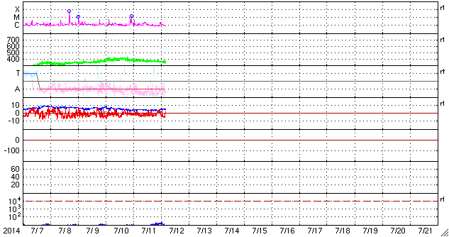 - 2014/ 7/ 9 11:58 M6.5、M1.2の中規模フレアが発生しました。太陽風は低速です。