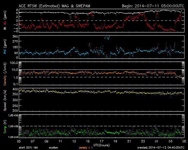 - 2014/ 7/ 8 12:59 太陽風は低速風が続いていますが、340km/秒程度に少し上がっています。