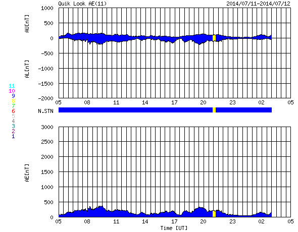 下段のAEグラフの値が高くなると、オーロラ活動が活発化しています。