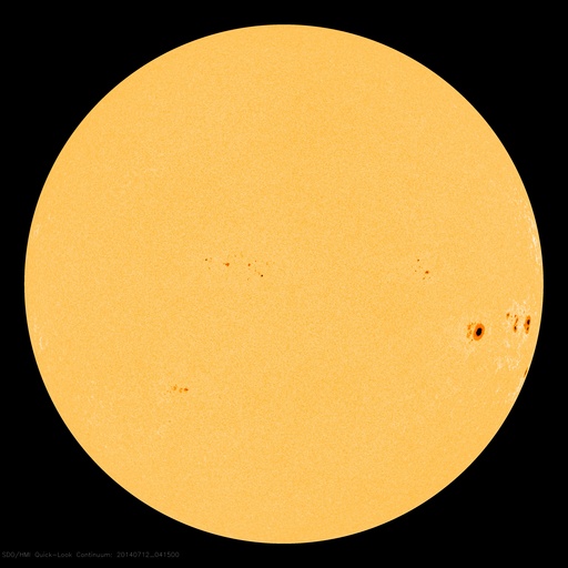 SDO衛星による太陽の可視光写真。マウスの矢印を写真に重ねると、黒点番号付きの写真に切り替わります。