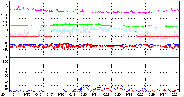 (c) SDO (NASA)、 (写真加工 : 宇宙天気ニュース) ![]() SDO衛星のAIA193カメラによる太陽コロナの様子 (c) SDO (NASA) ![]() SDO衛星による太陽の可視光写真。マウスの矢印を写真に重ねると、黒点番号付きの写真に切り替わります。 (c) SDO (NASA) ![]() GOES衛星の太陽X線データ (c) NOAA/SWPC ![]() ACEが観測した太陽風の磁場(1番上の枠、白線は全体の強度、赤線は南北成分) および、太陽風の密度(3番目の橙線)、速度(4番目の黄線) (c) NOAA/SWPC ![]() リアルタイムAE指数 下段のAEグラフの値が高くなると、オーロラ活動が活発化しています。 (c) 京都大学, NICT ![]() 27日の太陽周期に合わせたデータプロット 太陽が同じ面を地球に向けていた27日前の変化から、今後を予想することができます。 (c) 作図:宇宙天気ニュース