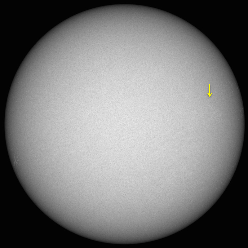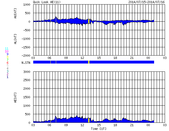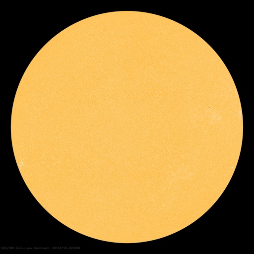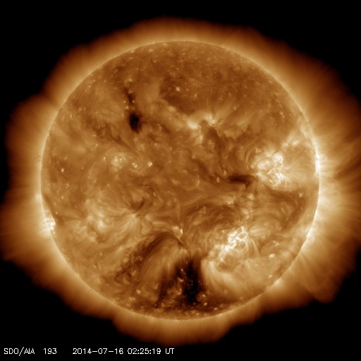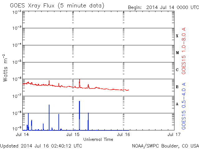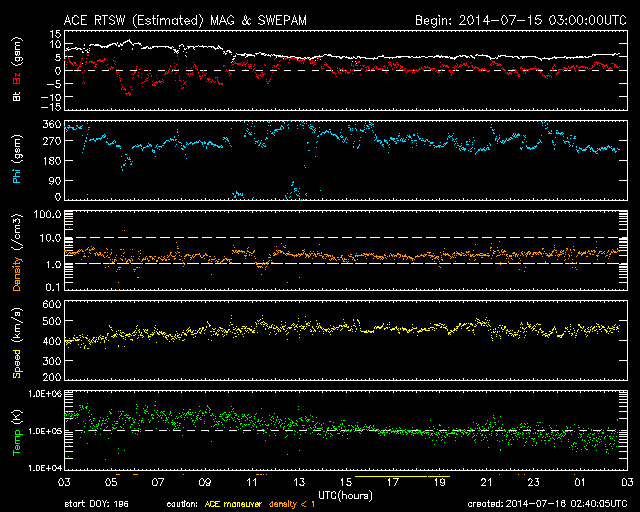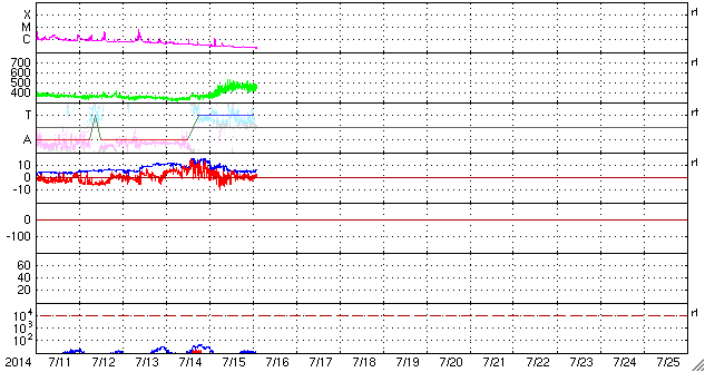 2014/ 7/16 11:40 更新 太陽の黒点が1つだけと少なくなっています。太陽風はやや高速です。 担当 篠原 太陽面が急に寂しくなって来ましたが、 今日の写真では、 黒点が1つだけになっています。 太陽全体の可視光写真を掲載します。 西の端(右端)近くに小さい黒点が見えています。 この黒点は昨日までこの辺りに見えていた 2113黒点群とは別の黒点の様で、 昨夜から見える様になりました。 この黒点がなければ、無黒点の太陽になるところでした。 黒点相対数の記録では、 太陽が無黒点になったのは2011年8月14日が最後です。 この後、完全に黒点が消える様だと3年ぶりとなります。 11年周期で考えると、 太陽の黒点はこれから次第に少なくなっていきます。 今日の様に黒点の少ない日が増えてくるでしょう。 太陽はフレアの発生もなく、静かです。 X線のグラフは、強度も次第に下がっています。 太陽風は、昨日のニュースの後にゆっくりと速度が上がり、 450km/秒とやや高速の状態になっています。 27日周期の図を見ると、セクターの切り替わりが到来しています。 これに伴って、太陽風の様子が変わった様です。 磁場強度は5nTと平均的な値に下がって、落ち着いています。 磁場の南北成分は0nT付近で小さく変化していて、 時々、磁気圏で小さい変動が発生しています。 SDO衛星AIA193では、 南半球のコロナホールはちょうど太陽の中心線に来ています。 影響が及ぶ様になると、速度はもう一段高まるかもしれません。