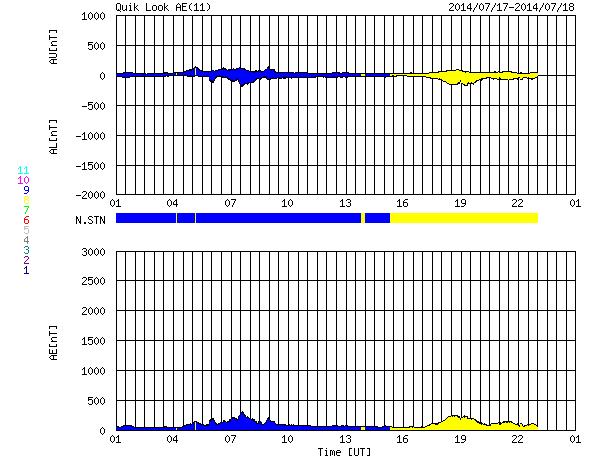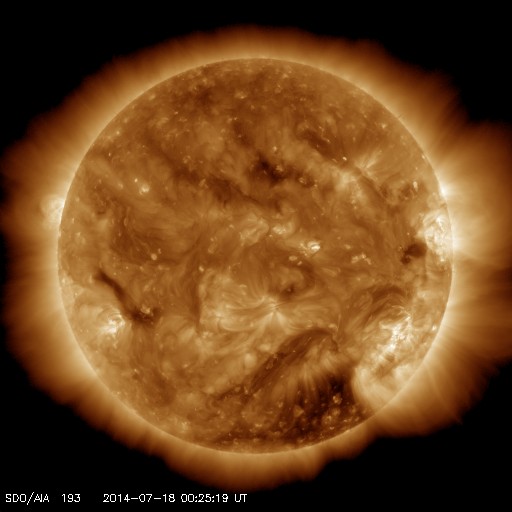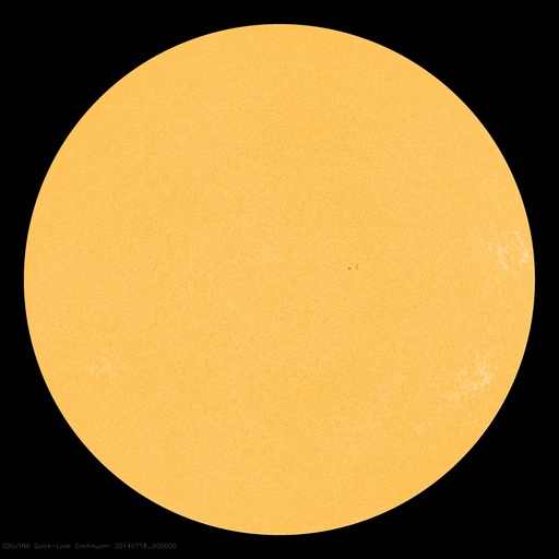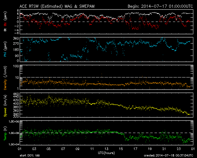 2014/ 7/18 09:37 更新 太陽に小さい黒点が現れ、無黒点の状態は終わっています。 担当 篠原 太陽に黒点が発生し、無黒点の状態は終わっています。 昨日のニュースのすぐ後、太陽の中央部に小さい黒点が現れました。 その黒点は夜になると消えたのですが、 18日に入った頃に次の黒点が現れ、現在もその黒点は残っています。 15日朝から今朝にかけての太陽の様子を、動画にしました。 初めは西寄り(右側)に小さい黒点が見えていますが、 やがてそれが消え、太陽は無黒点になります。 その状態がしばらく続いた後、中央部に新しく黒点が出現します。 今回の太陽の無黒点状態は、一瞬のできごとでした。 太陽は、X線グラフの強度も下がっていて、とても穏やかです。 グラフにはいくつかフレアの変化も見えますが、 Bクラスの小さいものばかりです。 太陽風は、18日に入った頃から速度が低下を始め、 現在は340km/秒と低速の状態に変わっています。 磁場強度も、2〜4nTと弱い状態で小さく変化しています。 磁場の南北成分は、 振れ幅は小さいですが南北に変化しています。 このため、小規模の磁気圏活動が起きている様で、 AE指数は200nTくらいの小さい山が続く時間帯があります。 SDO衛星AIA193の南半球高緯度域のコロナホールは、 西側にだいぶ進んでいます。 この領域からの弱い影響がこれから見られるかもしれません。 ![]() SDO衛星による15日から約3日間の太陽の様子。黒点が完全に見えなくなり、やがて現れます。 (c) SDO (NASA)、 (動画加工 : 宇宙天気ニュース) ![]() SDO衛星のAIA193カメラによる太陽コロナの様子 (c) SDO (NASA) ![]() SDO衛星による太陽の可視光写真。マウスの矢印を写真に重ねると、黒点番号付きの写真に切り替わります。 (c) SDO (NASA) ![]() GOES衛星の太陽X線データ (c) NOAA/SWPC ![]() ACEが観測した太陽風の磁場(1番上の枠、白線は全体の強度、赤線は南北成分) および、太陽風の密度(3番目の橙線)、速度(4番目の黄線) (c) NOAA/SWPC ![]() リアルタイムAE指数 下段のAEグラフの値が高くなると、オーロラ活動が活発化しています。 (c) 京都大学, NICT ![]() 27日の太陽周期に合わせたデータプロット 太陽が同じ面を地球に向けていた27日前の変化から、今後を予想することができます。 (c) 作図:宇宙天気ニュース