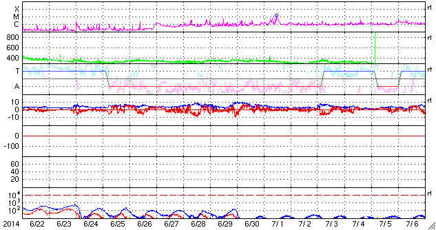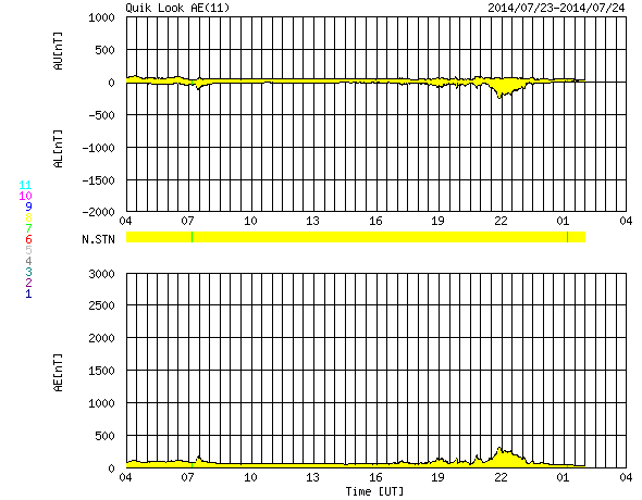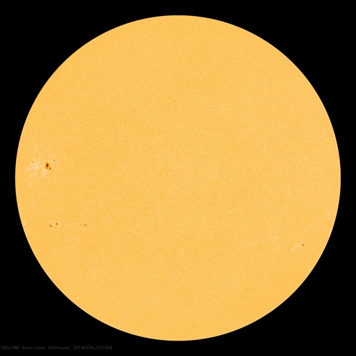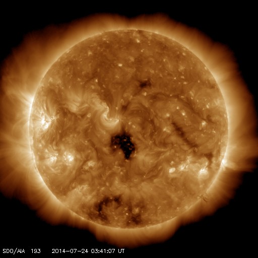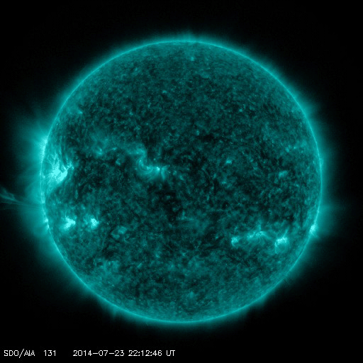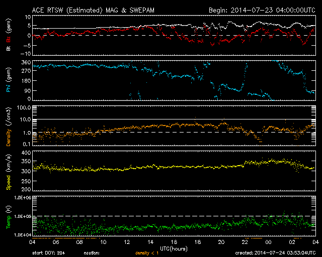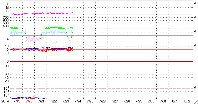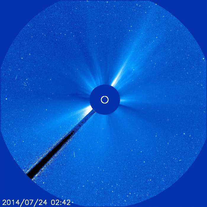2014/ 7/24 12:53 更新 9日ぶりにCクラスの小規模フレアが発生しました。太陽風は低速です。 担当 篠原 SOHO衛星LAASCO C3の左側から、 かに座のプレセペ星団が姿を見せています。 小さい星の集まりがプレセペで、 それを囲む四角形の星の並びは、かに座の甲羅です。 プレセペ星団は、毎年この時期になると、 太陽の向こう側を通過していきます。 これから2週間くらいLASCO C3の画面で見ることができます。 太陽では、7月15日以来、 C以上のフレアが起きていないと書きましたが、 今朝、24日10時半(世界時24日1時半)に、 2121黒点群でC2.1の小規模フレアが発生しました。 9日ぶりのCクラスフレアの発生です。 フレアの様子を、SDO衛星AIA131の動画で紹介します。 小さい規模のフレアなので、 動画としては一瞬輝きが発生するだけです。 太陽の黒点は、2123群を加えて、4つの黒点群が見えています。 X線グラフの変化は、このC2.1程度で、 全体としては穏やかです。 太陽風は、300km/秒台前半の低速風が続いています。 ACEのグラフでは、 今朝、一時的に340km/秒くらいに上がる変化も起きていますが、 現在は310km/秒とむしろ遅くなっています。 磁場強度は、4〜5nTと平均的な強さが続いています。 磁気圏も概ね静穏ですが、 太陽風磁場の弱い南向きに対応して、 AE指数には300nT程度の小規模の変化が起きています。 SDO衛星AIA193の太陽写真は、 ちょうど中央にコロナホールの丸い穴が見えています。 この領域の影響が3〜4日後くらいにやって来るかもしれません。 それがなければ、低速の穏やかな太陽風が続くでしょう。 ![]() SOHO衛星LASCO C3カメラの左側に、プレセペ星団が現れました。 (c) SOHO (ESA & NASA)、動画作成 : 宇宙天気ニュース ![]() 9日ぶりにCクラスのフレアが発生しました。SDO衛星AIA131。 (c) SDO (NASA)、 (動画加工 : 宇宙天気ニュース) ![]() SDO衛星のAIA193カメラによる太陽コロナの様子 (c) SDO (NASA) ![]() SDO衛星による太陽の可視光写真。マウスの矢印を写真に重ねると、黒点番号付きの写真に切り替わります。 (c) SDO (NASA) ![]() GOES衛星の太陽X線データ (c) NOAA/SWPC ![]() ACEが観測した太陽風の磁場(1番上の枠、白線は全体の強度、赤線は南北成分) および、太陽風の密度(3番目の橙線)、速度(4番目の黄線) (c) NOAA/SWPC ![]() リアルタイムAE指数 下段のAEグラフの値が高くなると、オーロラ活動が活発化しています。 (c) 京都大学, NICT ![]() 27日の太陽周期に合わせたデータプロット 太陽が同じ面を地球に向けていた27日前の変化から、今後を予想することができます。 (c) 作図:宇宙天気ニュース