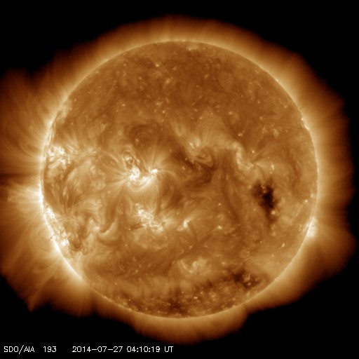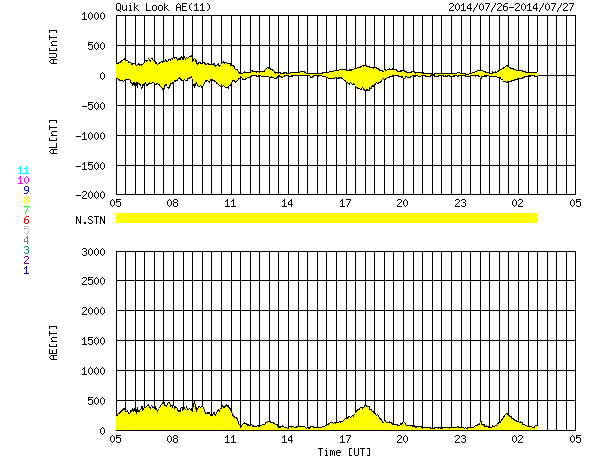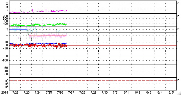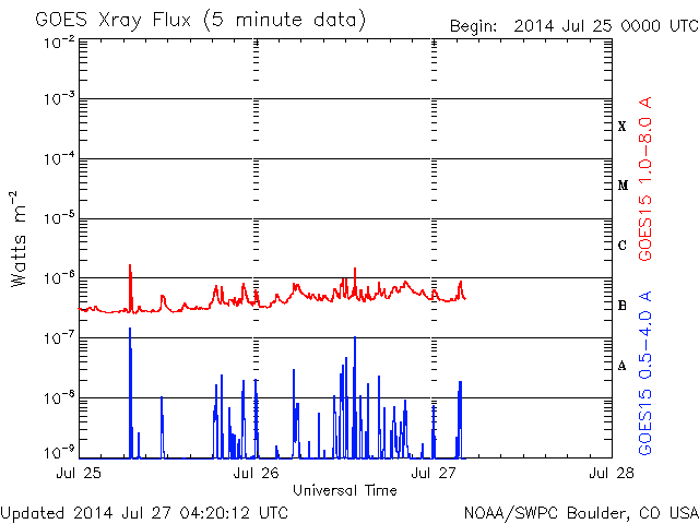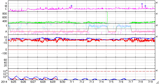 2014/ 7/27 13:22 更新 太陽では小さい活動が増えてきました。太陽風は低速ですが、磁気圏では弱い活動も起きています。 担当 篠原 太陽は、中央の少し南側の2123黒点群や、 東端の領域で小さいフレアの活動が頻繁に起きています。 そのうちのいくつかはCクラスの規模に達して、 2123群でC1.0、C1.1、C1.8、 2125群ではC1.0のフレアが発生しています。 また、2123群のすぐ上には、 新しく2126群が出現しています。 これらの領域の活動に注目して下さい。 太陽風の速度は、昨日の夕方から380km/秒に少し上がり、 今朝くらいに再び下がって、 350km/秒の低速風に戻っています。 磁場強度も同様に、 一旦、8nTくらいに上がりましたが、 現在は5nTに戻っています。 27日周期の太陽風のグラフを見るとよく分かりますが、 いずれも小さい変化で、 太陽風は全体としては穏やかな状態が続いています。 一方、磁場の南北成分は、振れ幅は小さいですが、 南に向いたり北に向いたりと変化を繰り返しています。 このため、磁気圏では弱い活動が発生して、 AE指数は頻繁に400nTくらいの変化をしています。 太陽風は穏やかな状態が続きそうですが、 SDO衛星AIA193の西側に進んでいるコロナホールの影響が 見られるでしょうか。