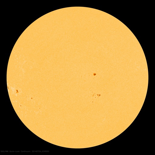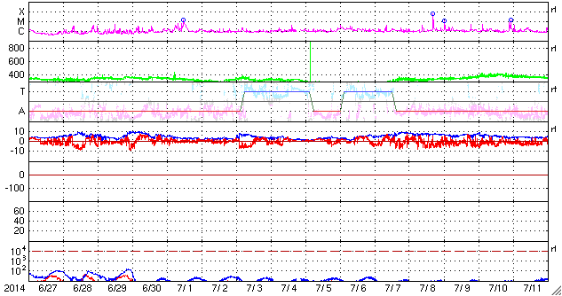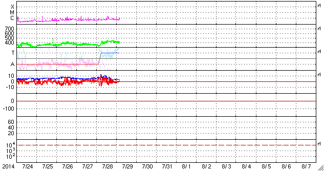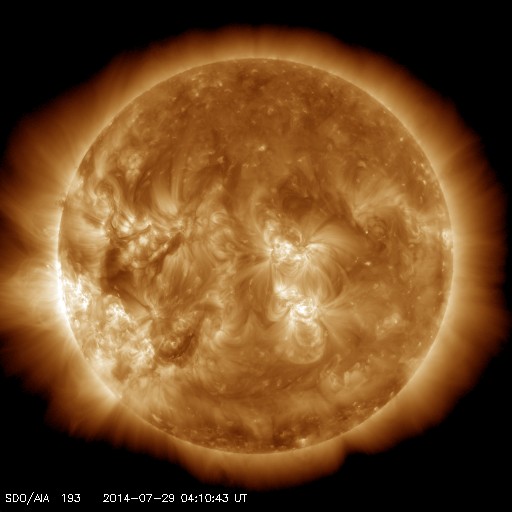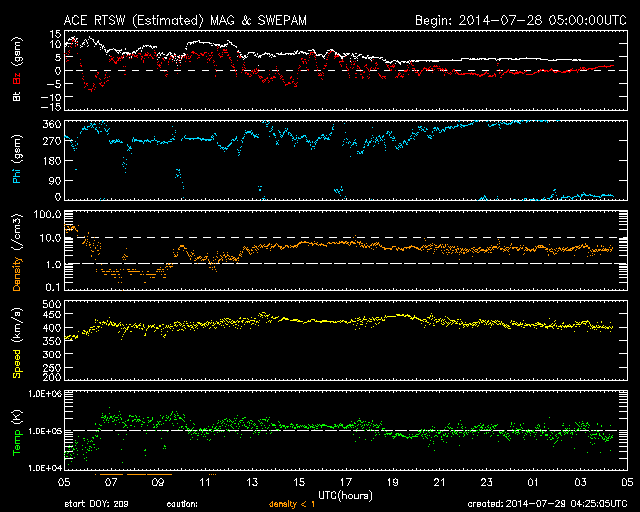2014/ 7/29 13:26 更新 太陽風の速度が400km/秒台に戻っています。Cクラスの小さいフレアが発生しています。 担当 篠原 昨日のニュース以降、太陽風の速度が少し上がり、 420km/秒と平均的な速さになりました。 そのまま安定して、現在も400km/秒付近を保っています。 同時に、太陽風の磁場強度も10nTに強まる変化が見られました。 27日周期の図を見ると、 ここでセクターの切り替わりが起きた様です。 速度の高まりも、関係した変化ではないかと思います。 太陽風の磁場強度はすぐに下がって、 今日の未明には、4nTと平均的な状態に戻っています。 磁場が強まったことで、 南向きに振れた時の影響もより大きくなり、 AE指数は、600nTの変化を含めて少し活発になっています。 磁場強度は既に下がっているので、 磁気圏の変化も、今後はより小さいものになるでしょう。 太陽風の速度も、これ以上高まる様子はありません。 しばらくして、再び300km/秒台に下がって行きそうです。 太陽は、2126群の上に新しく2129群が発生し、 東端からも新しい黒点が顔を出しています。 太陽は、つい2週間前に無黒点になりましたが、 にぎやかさが戻ってきました。 フレアは、東側の2125群でC1.2、C2.4、 中央の2126群でC1.6と、ちょうど今、C1.2が起きています。 規模は小さいですが、フレアの発生が続いています。 東端から現れた黒点群も、 これからどの様な活動を見せるのでしょうか。 ![]() SDO衛星のAIA193カメラによる太陽コロナの様子 (c) SDO (NASA) ![]() SDO衛星による太陽の可視光写真。マウスの矢印を写真に重ねると、黒点番号付きの写真に切り替わります。 (c) SDO (NASA) ![]() ACEが観測した太陽風の磁場(1番上の枠、白線は全体の強度、赤線は南北成分) および、太陽風の密度(3番目の橙線)、速度(4番目の黄線) (c) NOAA/SWPC ![]() リアルタイムAE指数 下段のAEグラフの値が高くなると、オーロラ活動が活発化しています。 (c) 京都大学, NICT ![]() 27日の太陽周期に合わせたデータプロット 太陽が同じ面を地球に向けていた27日前の変化から、今後を予想することができます。 (c) 作図:宇宙天気ニュース