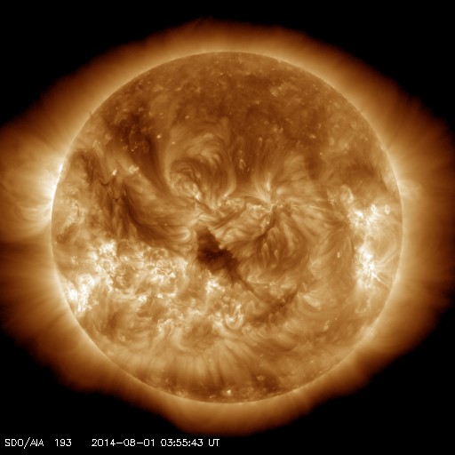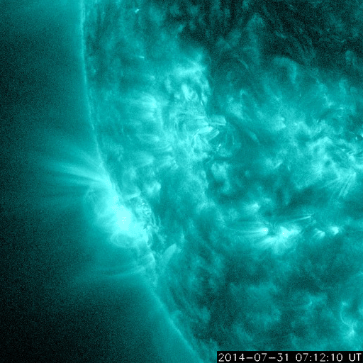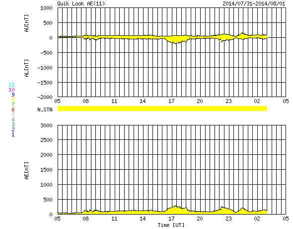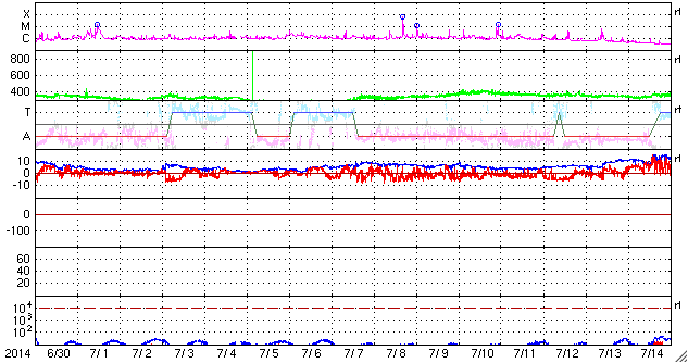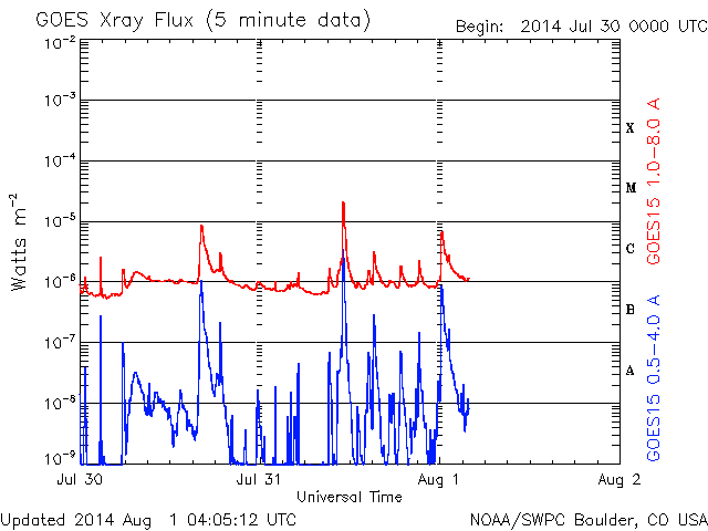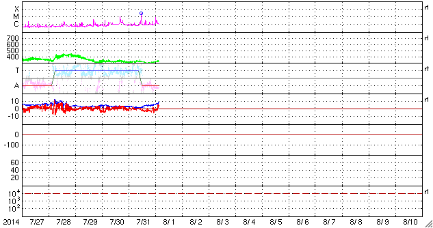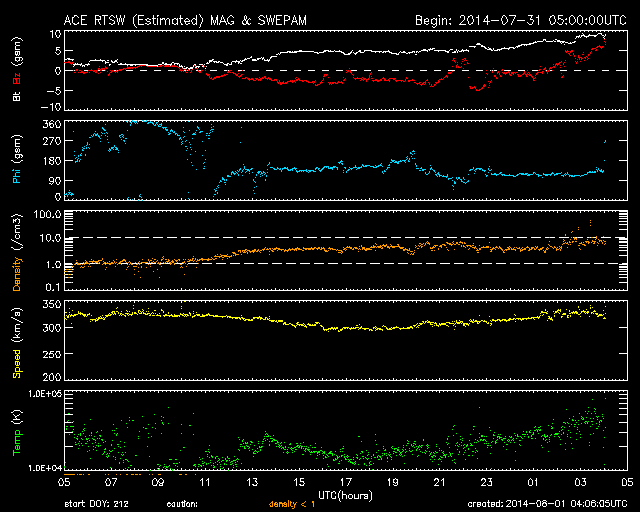 2014/ 8/ 1 13:06 更新 M2.5の中規模フレアが発生しました。太陽風は低速ですが、磁場が強まっています。 担当 篠原 太陽の東側(左側)に見える2130黒点群で、 昨夜、31日20時(世界時30日11時)に、 M2.5の中規模フレアが発生しました。 Mクラスのフレアは、7月10日のM1.5以来で、 3週間ぶりのことです。 SDO衛星AIA131による、 2130黒点群付近の活動の様子を紹介します。 一番明るく輝く現象が、M2.5のフレアで、 その後も、C3.5、C1.9、C2.4と小規模フレアが続き、 最後の、8月1日9時(世界時1日0時)に、 となりの2132黒点群でC8.6と 大きいCクラスフレアが発生しています。 GOES衛星のX線写真では、 東端の北半球側からも次の活動領域が近づいている様です。 太陽の活動の高まりに注目してください。 太陽風は、低速風が続いていますが、 磁場強度が高まっています。 太陽風の速度は、昨日の330km/秒から、 一時的に300km/秒まで下がりましたが、 その後、再び330km/秒に戻っています。 一方、磁場強度は、昨日は0nT近くまで小さくなっていましたが、 夜くらいから強まり始め、 半日ほどかけて10nTまで高まっています。 この変化が、磁場強度の高まりだけで終わるのか、 速度の高まりを伴うのか、しばらく注目して下さい。 また、27日周期の図を見ると、磁場が弱まったところで、 セクターの切り替わりが発生しています。 磁場強度が強まって、 南北成分の変化も目立ち始めています。 昨夜から、-3nT程度の南向きが続き、 今朝からは北向きに振れて、現在は+5nTに振れています。 速度がかなり遅いので、AE指数の変化は小規模ですが、 200nTくらいの活動が続いています。 今後、磁場が南向きに大きく振れると、 より大きい活動も発生するでしょう。 SDO衛星AIA193を見ると、太陽の中心から北東(左上)にかけて、 コロナホールが伸びているようです。 3日ほど経つと、この領域の影響もやって来るかもしれません。