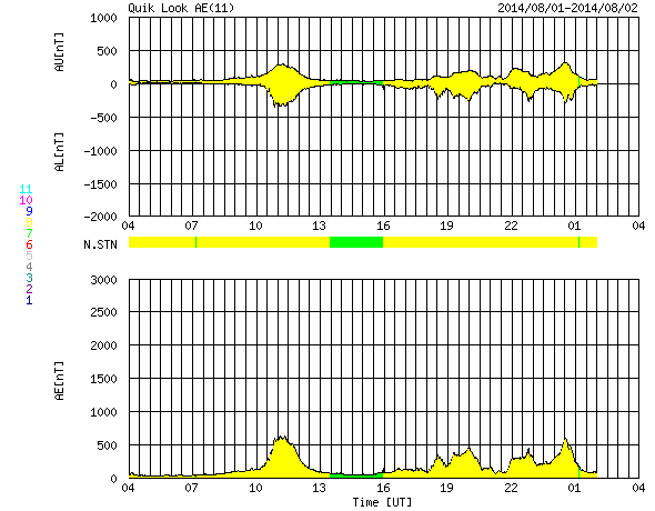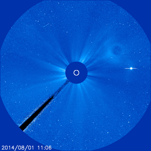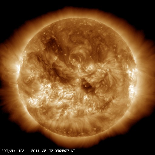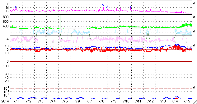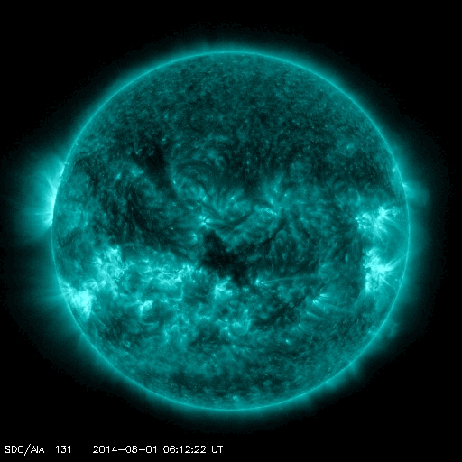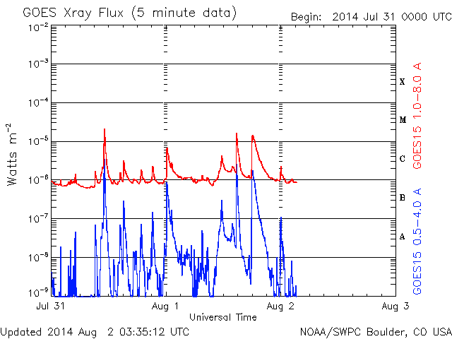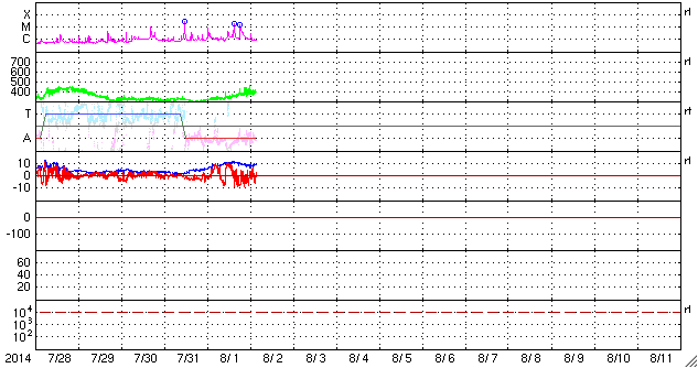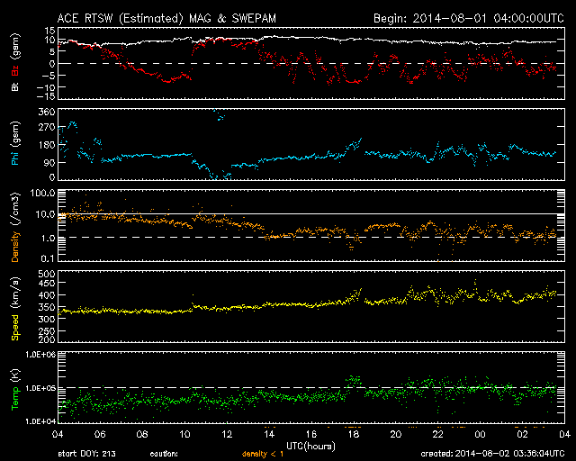 2014/ 8/ 2 12:32 更新 Mクラスのフレアが2回発生しました。CMEの噴出も起きています。 担当 篠原 太陽の活動が活発さを増しています。 昨夜、1日23時半(世界時1日14時半)に2130黒点群でM2.0、 深夜の2日3時(世界時1日18時)に2127黒点群でM1.5と、 2つの中規模フレアが発生しています。 また、その直前、1日19時(世界時1日10時)には、 中心部の北側でフィラメント噴出の様な爆発が発生しています。 このため、SOHO衛星LASCO C3の動画を見ると、 太陽の北側(上側)と南東側(左下側)を中心とするCMEの噴出が 2つ発生しています。 発生地点が太陽の中心に近いことから、 噴出したガスは地球にも向かっている可能性があり、 到着まで3〜4日と考えると、4日深夜から6日にかけて、 太陽風の乱れが到来するかもしれません。 30日に発生したCMEの到来が、明日、明後日くらいと考えると、 連続的に乱れがやって来るかもしれません。 また、太陽の可視光写真を見ると、 東端から新しい黒点が現れています。 太陽風は、昨日のニュース以降ゆっくりと速度が上がって、 現在は400km/秒と平均的な状態になっています。 磁場強度は強まったままで、現在も9nTです。 もう少し速度の高まりが見られるかもしれません。 磁場の南北成分は、やや南寄りに推移しています。 磁気圏の活動度も上がっていて、 AE指数は500nTの中規模の変化が、 繰り返し発生しています。 今後は、CMEによる太陽風の乱れの到来に注目して下さい。 速度の変化は小規模になりそうですが、 磁場が強まって南向きに大きく振れると、 磁気圏のオーロラ活動が激しくなります。 ![]() Mクラスフレアが2回発生するなど、太陽の活動が高まっています。 (c) SDO (NASA)、 (動画加工 : 宇宙天気ニュース) ![]() SOHO衛星LASCO C3カメラによる、太陽の北と南東を中心に噴出する2つのCME。 (c) SOHO (ESA & NASA)、 (動画加工 : 宇宙天気ニュース) ![]() SDO衛星のAIA193カメラによる太陽コロナの様子 (c) SDO (NASA) ![]() SDO衛星による太陽の可視光写真。マウスの矢印を写真に重ねると、黒点番号付きの写真に切り替わります。 (c) SDO (NASA) ![]() GOES衛星の太陽X線データ (c) NOAA/SWPC ![]() ACEが観測した太陽風の磁場(1番上の枠、白線は全体の強度、赤線は南北成分) および、太陽風の密度(3番目の橙線)、速度(4番目の黄線) (c) NOAA/SWPC ![]() リアルタイムAE指数 下段のAEグラフの値が高くなると、オーロラ活動が活発化しています。 (c) 京都大学, NICT ![]() 27日の太陽周期に合わせたデータプロット 太陽が同じ面を地球に向けていた27日前の変化から、今後を予想することができます。 (c) 作図:宇宙天気ニュース