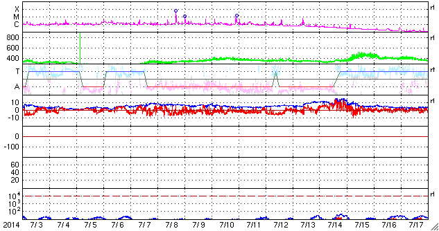 - 2014/ 7/30 14:21 太陽風は330km/秒と低速です。Cクラスのフレアが増えてきました。