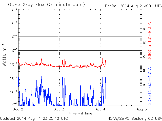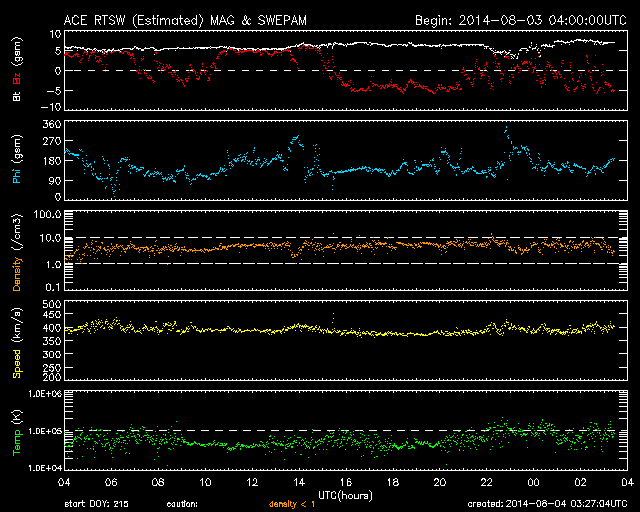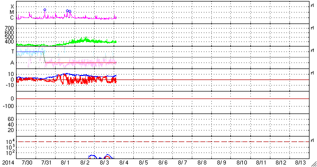 - 2014/ 8/ 1 13:06 M2.5の中規模フレアが発生しました。太陽風は低速ですが、磁場が強まっています。