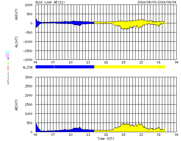 下段のAEグラフの値が高くなると、オーロラ活動が活発化しています。