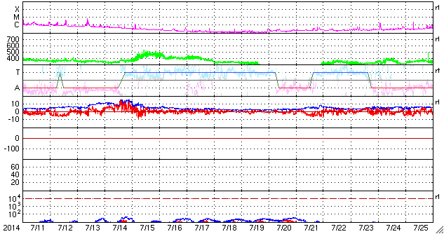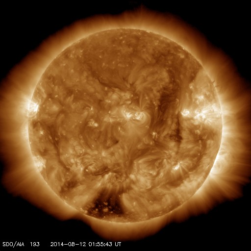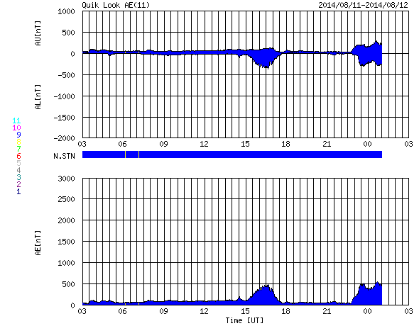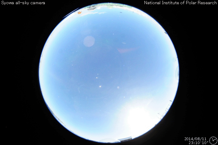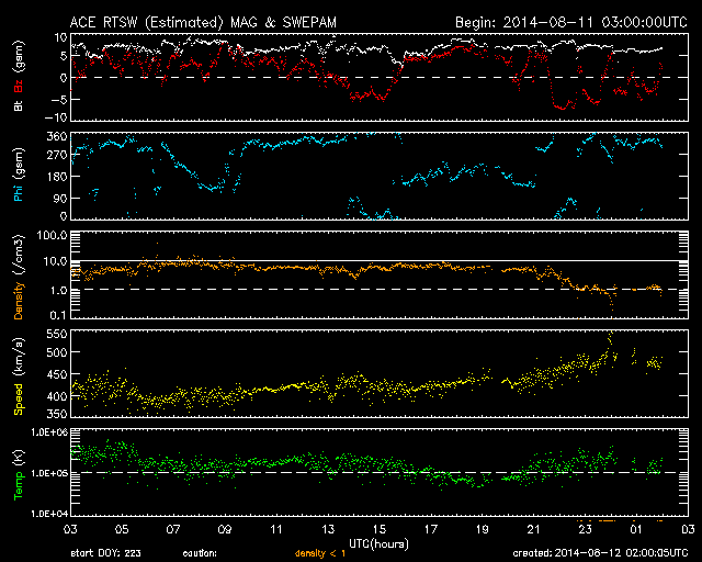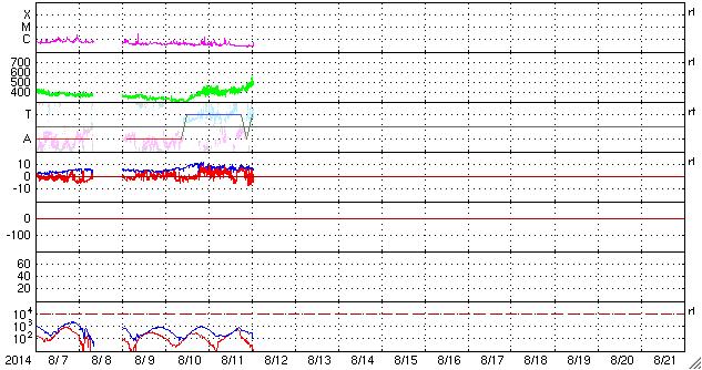 2014/ 8/12 11:01 更新 太陽風はやや高速になっています。太陽は穏やかです。 担当 篠原 太陽風の速度は、400km/秒から470km/秒へ上がり、 やや高速になっています。 磁場強度は、6nTへ少しだけ下がっています。 太陽風の弱い高まりは続いています。 磁場の南北成分は、北寄りの時間が長いのですが、 時々、南向きに振れています。 12日8時(世界時11日22時)には -7nTと 南向きがやや強まって、磁気圏の活動を高めています。 この時間帯の昭和基地のオーロラを動画で紹介します。 満月を過ぎたばかりの月のため、 空がかなり明るくなっていますが、 それに重なるようにオーロラの光が空全体に広がっています。 AE指数では、500nT程度の中規模の変化になっています。 太陽風の高まりは、次第に弱まり、 再び低速の穏やかな太陽風に戻るでしょう。 太陽は、西に没した2132黒点群で C1.3の小さいCクラスフレアが発生した程度で、 活動は穏やかです。 東の端(左端)に現れた黒点には、2139群と番号が付き、 西の端(右端)にも、2138群が出現しています。 ![]() 南極の昭和基地で、世界時11日23時に観測されたオーロラ。月明かりで空がかなり明るくなっています。 (c) 国立極地研究所、(動画加工 : 宇宙天気ニュース) ![]() SDO衛星のAIA193カメラによる太陽コロナの様子 (c) SDO (NASA) ![]() SDO衛星による太陽の可視光写真。マウスの矢印を写真に重ねると、黒点番号付きの写真に切り替わります。 (c) SDO (NASA) ![]() ACEが観測した太陽風の磁場(1番上の枠、白線は全体の強度、赤線は南北成分) および、太陽風の密度(3番目の橙線)、速度(4番目の黄線) (c) NOAA/SWPC ![]() リアルタイムAE指数 下段のAEグラフの値が高くなると、オーロラ活動が活発化しています。 (c) 京都大学, NICT ![]() 27日の太陽周期に合わせたデータプロット 太陽が同じ面を地球に向けていた27日前の変化から、今後を予想することができます。 (c) 作図:宇宙天気ニュース
