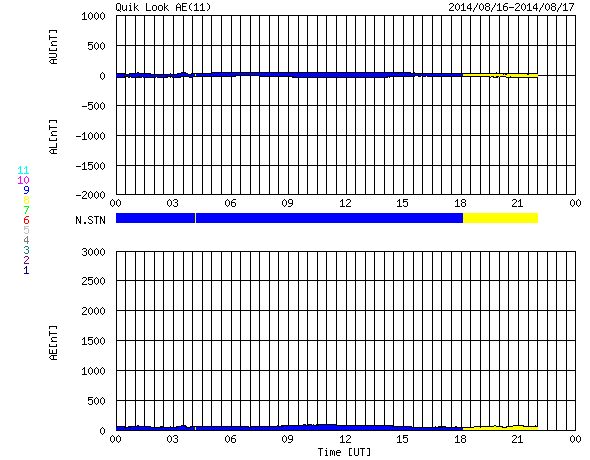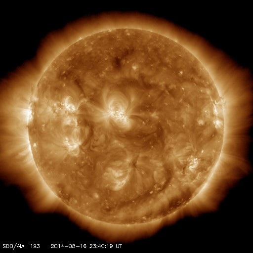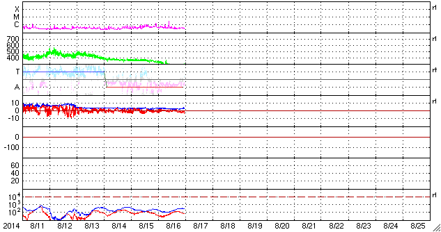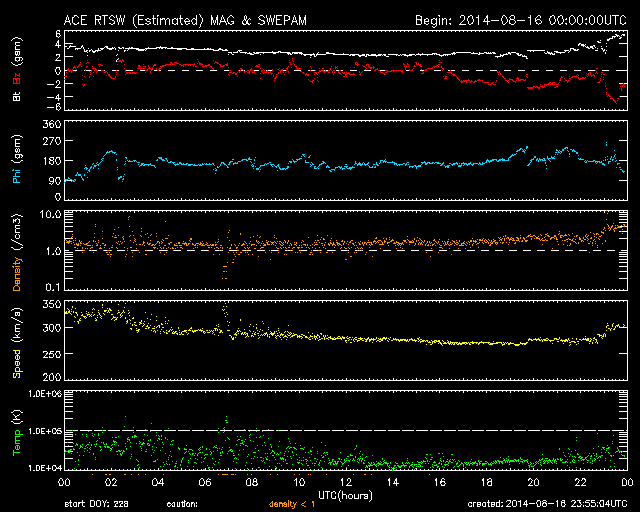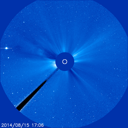 2014/ 8/17 08:56 更新 太陽は比較的穏やかです。太陽風は300km/秒とかなり低速です。 担当 篠原 昨日紹介したCMEのその後を、 SOHO衛星LASCO C3の動画で紹介します。 太陽全体を囲む様にガスは淡く広がっていますが、 これは、CMEが地球の方向に噴き出したため、 見かけ上、全方位に広がっている様に見えるのです。 噴出の規模は比較的小さい様ですし、 現在の太陽風はかなり低速になっているので、 地球へは5日くらいかかりそうです。 すると、太陽風の乱れの到来は、21日前後になりそうです。 変化は小さいと思いますが、 磁場の強まりがやって来て、南向きに振れると、 オーロラの活動を活発にするでしょう。 太陽では、中央の2139黒点群でC1.0、 西側(左側)の2144群でC2.7と、 小さい小規模フレアが発生した程度です。 一方、GOES衛星のX線写真の動画では、 この他にも小さい活動があちこちで起きていて、 少しにぎやかな印象も受けます。 また、東端(左端)から新しい黒点が現れています。 太陽風は、速度が更に下がって、 270km/秒とかなり遅い状態になりました。 先ほど少し上がって、現在は300km/秒ですが、 依然、かなり遅い速度です。 磁場強度は、3nTから2nT近くまで弱まりましたが、 現在は5nTに少し上がっています。 速度の変化もあり、 太陽風の様子が少し変わるのかもしれません。 磁気圏は静穏で、AE指数は全く変化していません。 ACEの図では、太陽風磁場の南北成分が、 最新のところで南向きに振れています。 この傾向が続くと、 小規模のオーロラの活動が見られそうです。 ![]() 昨日のCMEのその後の様子。SOHO衛星LASCO C3。 (c) SOHO (ESA & NASA)、(動画加工 : 宇宙天気ニュース ) ![]() SDO衛星のAIA193カメラによる太陽コロナの様子 (c) SDO (NASA) ![]() SDO衛星による太陽の可視光写真。マウスの矢印を写真に重ねると、黒点番号付きの写真に切り替わります。 (c) SDO (NASA) ![]() GOES衛星の太陽X線データ (c) NOAA/SWPC ![]() ACEが観測した太陽風の磁場(1番上の枠、白線は全体の強度、赤線は南北成分) および、太陽風の密度(3番目の橙線)、速度(4番目の黄線) (c) NOAA/SWPC ![]() リアルタイムAE指数 下段のAEグラフの値が高くなると、オーロラ活動が活発化しています。 (c) 京都大学, NICT ![]() 27日の太陽周期に合わせたデータプロット 太陽が同じ面を地球に向けていた27日前の変化から、今後を予想することができます。 (c) 作図:宇宙天気ニュース