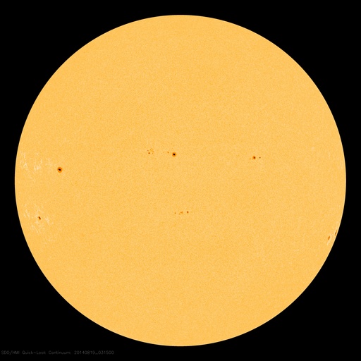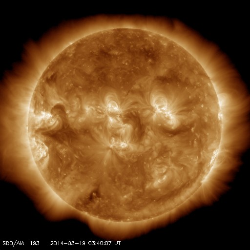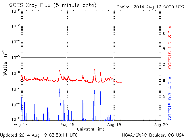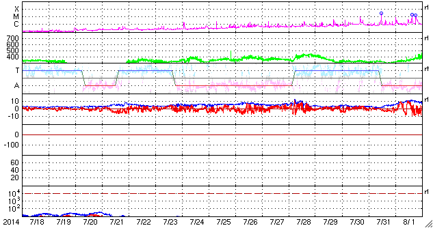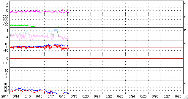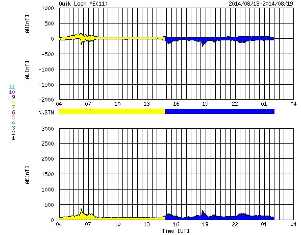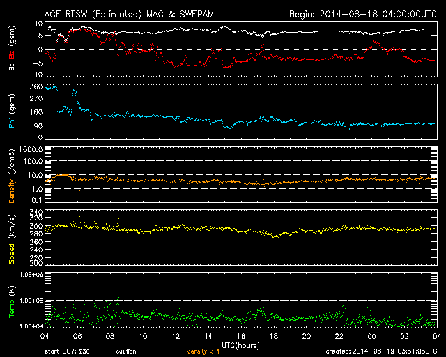 2014/ 8/19 12:52 更新 かなり遅い太陽風が続いています。太陽もC1のフレアが起きた程度で、穏やかです。 担当 篠原 太陽風は、290km/秒とかなり遅い状態が続いています。 27日周期の図では、 速度のグラフの下限を300km/秒にしているのですが、 緑色の線が枠の下に下がって3日ほど経過しています。 一方、磁場強度は7nTと少し高まったままで、 磁場の南北成分は、 ACEのグラフの途中から南寄りに振れています。 オーロラの活動も弱いものが発生している様で、 AE指数は、後半から200nT弱の変化が現れ、 昭和基地の全天カメラでは、曇り空を通してですが、 オーロラの淡い光が見えています。 太陽風は、この後も穏やかな状態が続きそうです。 太陽は、東端の2147黒点群でC1.8、 中央付近の2139群でC1.2と、 小さいCクラスのフレアが起きた程度で、活動は穏やかです。 東端の向こう側から新たな領域が現れる様子もなく、 穏やかな状態が続きそうです。
