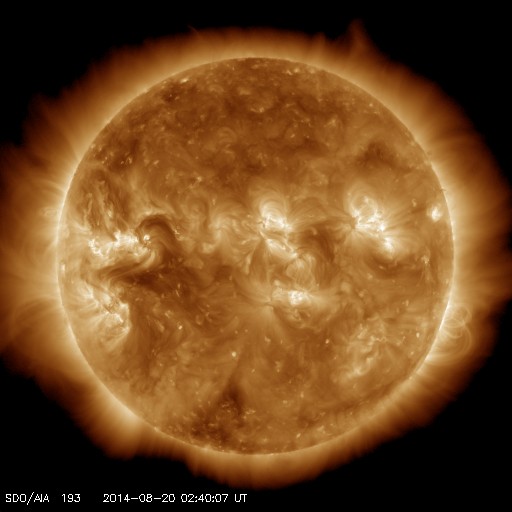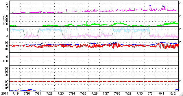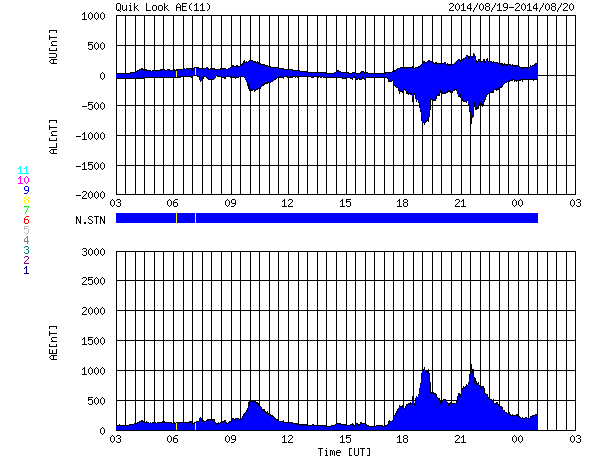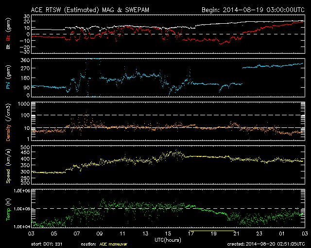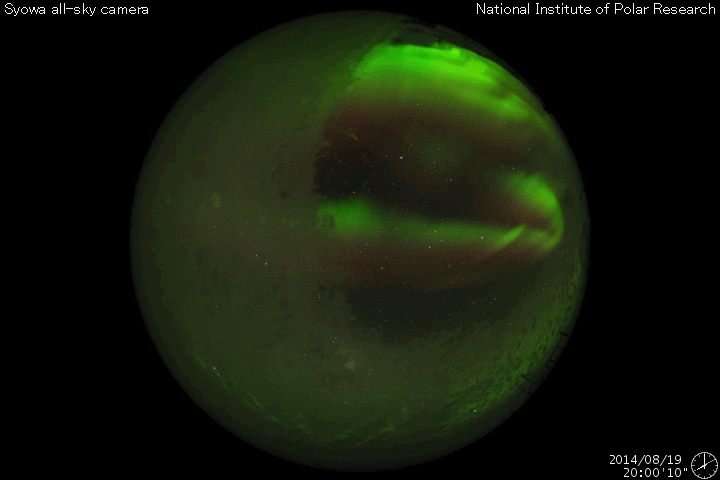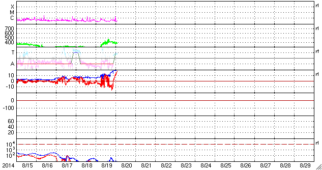 2014/ 8/20 11:51 更新 CMEによる太陽風の乱れが到来し、磁気圏の活動が強まっています。 担当 篠原 ACE衛星の観測によると、 16日1時(世界時15日16時)に発生したCMEによる太陽風の乱れが、 19日15時(世界時19日6時)に到来しました。 もう少し時間がかかるかと思っていたのですが、 3日半で地球までやって来ました。 最初の変化は小幅で、速度は350km/秒に、 磁場強度は10nTに高まった程度でしたが、 その後、半日から1日近くかけてそれぞれ高まり、 速度は450km/秒へ上がり(現在は380km/秒に下がっています)、 磁場強度は20nTに達しています(こちらは現在の値)。 速度は平均的な状態に上がった程度ですが、 磁場が大きく強まり、南向きにも振れて、 -10nTを超える変化も発生しています。 この影響で磁気圏の活動が強まり、 AE指数では1000nTに達する大規模な変化が、 2回発生しています。 この変化の頃の昭和基地のオーロラを、 全天カメラの動画で紹介します。 空全体を覆ってオーロラが激しく輝いています。 現在の太陽風磁場は北向きに降れていて、 磁気圏の活動は落ち着いています。 しかし、磁場強度は20nTに強まっているので、 再び南向きに振れると、活発な活動が発生するでしょう。 太陽風の乱れがどのくらい続くか注目してください。 今日いっぱいくらいで、 磁場強度も低下を始めるかもしれません。 太陽は、C1.9の小規模フレアが、 2146黒点群の左側の領域で発生しています。 Cクラスに達する変化はこの程度です。 今日は出張のため、神奈川県の大磯に来ています。 こちらは気持ちのいい青空で驚いています (九州はずっと雨と曇り空でした)。 暑くなりそうです・・・