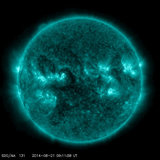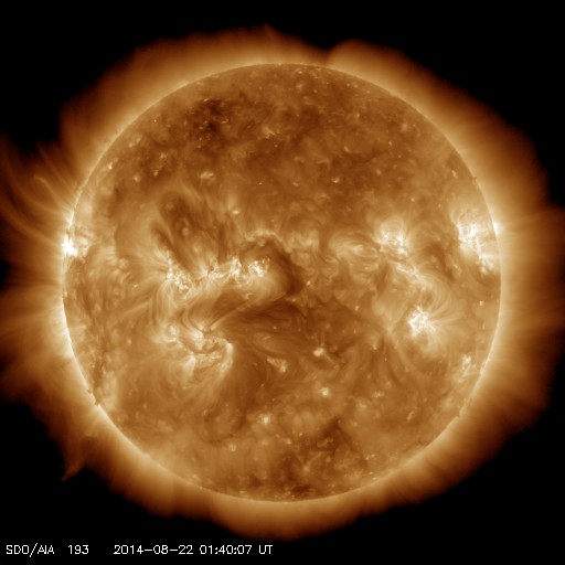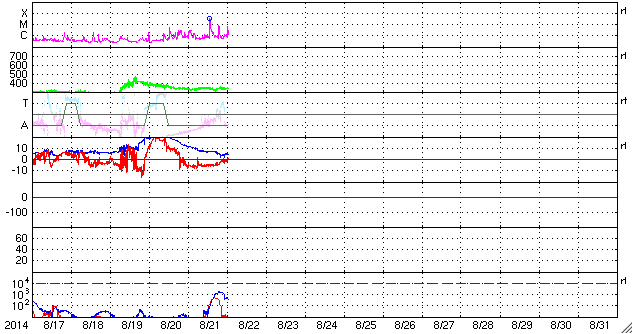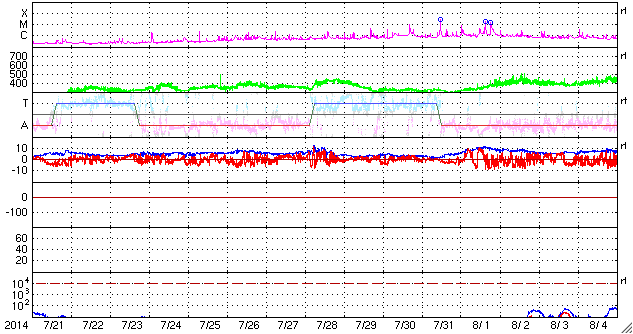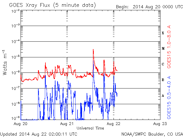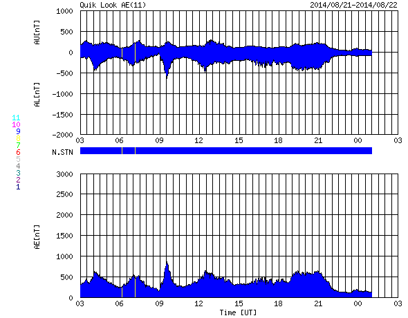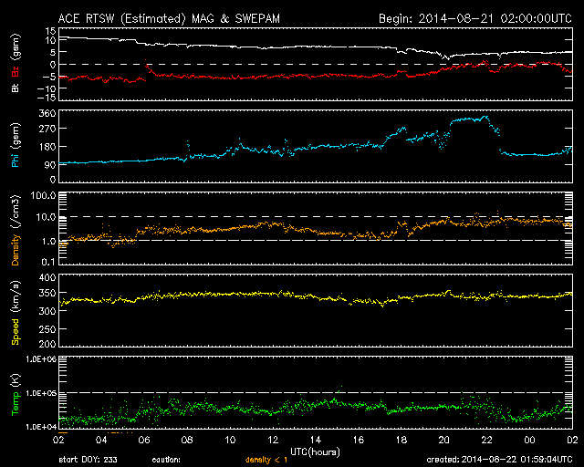 2014/ 8/22 11:00 更新 太陽の東端でM3.4の中規模フレアが発生しました。太陽風磁場の強まりは終わっています。 担当 篠原 昨日のニュースで太陽の東端から現れた活動的な領域は、 2149黒点群として姿を現しました。 そして、昨夜、21日22時(世界時21日13時)に M3.4の中規模フレアを起こしました。 Mクラスフレアの発生は、 世界時8月1日に発生したM1.5以来、20日ぶりです。 2149黒点群は、この後にも C7.3と大きいCクラスのフレアを起こしています。 活動の様子をSDO衛星AIA131の動画で紹介します。 2149群の今後の活動に注目してください。 これから活動が活発化すると、太陽の中心に近づくため、 地球へ影響が及びやすくなります。 太陽風は、330〜340km/秒と低速の状態が続いています。 昨日のニュースの頃は10nTに強まっていた磁場強度は、 ゆっくりと低下が続いて、 今朝くらいに5nTと平均的な値に戻っています。 CMEによる太陽風の乱れは通り過ぎました。 磁場が強まっていた間、 磁場の南北成分は、-5nTくらいの南向きが ずっと続いていました。 このため、磁気圏の活動も長時間続いて、 AE指数は500nT前後の中規模の変化が連続的に発生しています。 磁場の強まりが終わった後、 南北成分は0nT付近に下がっています。 AE指数も今後の変化は小さくなるでしょう。 太陽風は穏やかな状態に戻り、低速の風が続きそうです。 ![]() 太陽の東端でM3.4の中規模フレアが発生しました。SDO衛星AIA131。 (c) SDO (NASA)、 (動画加工 : 宇宙天気ニュース) ![]() SDO衛星のAIA193カメラによる太陽コロナの様子 (c) SDO (NASA) ![]() SDO衛星による太陽の可視光写真。マウスの矢印を写真に重ねると、黒点番号付きの写真に切り替わります。 (c) SDO (NASA) ![]() GOES衛星の太陽X線データ (c) NOAA/SWPC ![]() ACEが観測した太陽風の磁場(1番上の枠、白線は全体の強度、赤線は南北成分) および、太陽風の密度(3番目の橙線)、速度(4番目の黄線) (c) NOAA/SWPC ![]() リアルタイムAE指数 下段のAEグラフの値が高くなると、オーロラ活動が活発化しています。 (c) 京都大学, NICT ![]() 27日の太陽周期に合わせたデータプロット 太陽が同じ面を地球に向けていた27日前の変化から、今後を予想することができます。 (c) 作図:宇宙天気ニュース