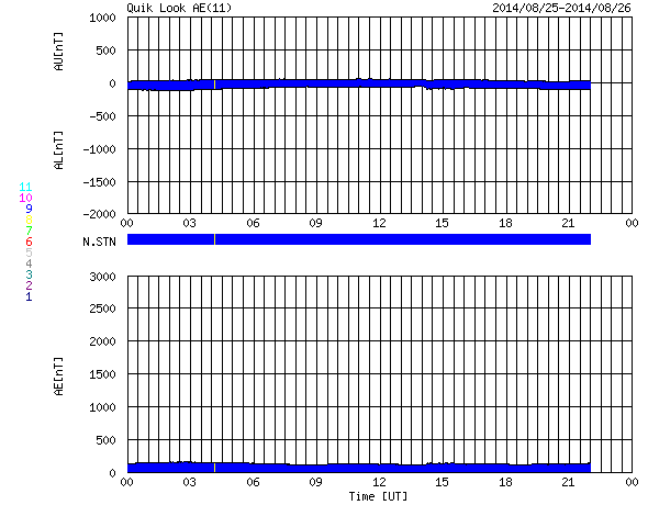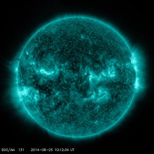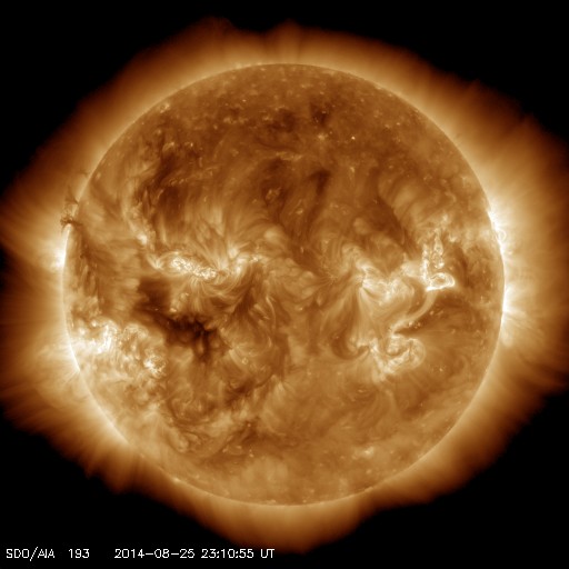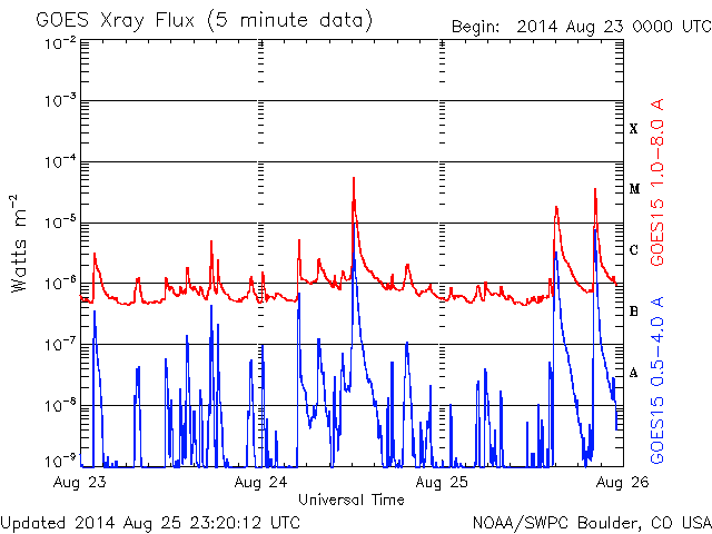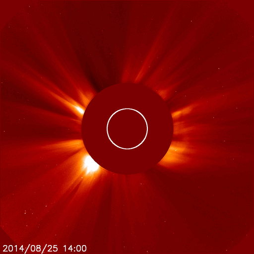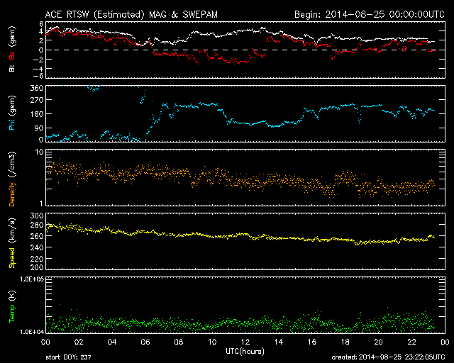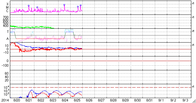 2014/ 8/26 08:22 更新 M2.0とM3.9の中規模フレアが発生しました。太陽風は250km/秒まで遅くなっています。 担当 篠原 太陽で、Mクラスフレアの発生が続いています。 昨夜は、太陽の西側(右側)の2146黒点群で、 26日0時(世界時25日15時)にM2.0、 26日5時(世界時25日20時)にM3.9と、 2つの中規模フレアが発生しています。 フレアの様子を、SDO衛星AIA131の動画で紹介します。 M2.0フレアに伴って、 CME(太陽ガスの放出現象)も発生しています。 SOHO衛星LASCO C2、C3の動画を見て下さい。 ガスは、右側を中心に噴き出していますが、 淡く、太陽全体を包む様にも広がっています。 このため、CMEの一部は地球にも向かっている可能性があります。 3日後くらいに太陽風の乱れが発生するかもしれません。 太陽では、2150群、2149群でも C1の小さいフレアが発生しています。 引き続き注目して下さい。 太陽風は、速度が更に下がって、 250km/秒近くまで遅くなっています。 磁場強度も弱まって、3nT前後です。 とても穏やかな太陽風です。 磁気圏の活動は静穏で、AE指数は全く変化していません。 太陽風は、基本的には低速の風が続きそうですが、 今後、CMEによる突発性の乱れが到来する可能性があります。