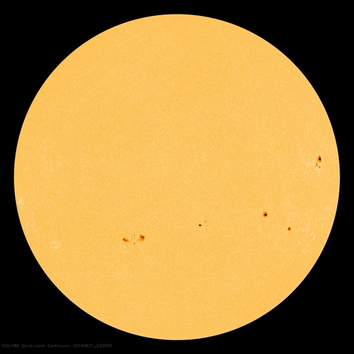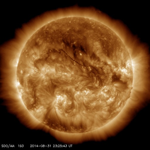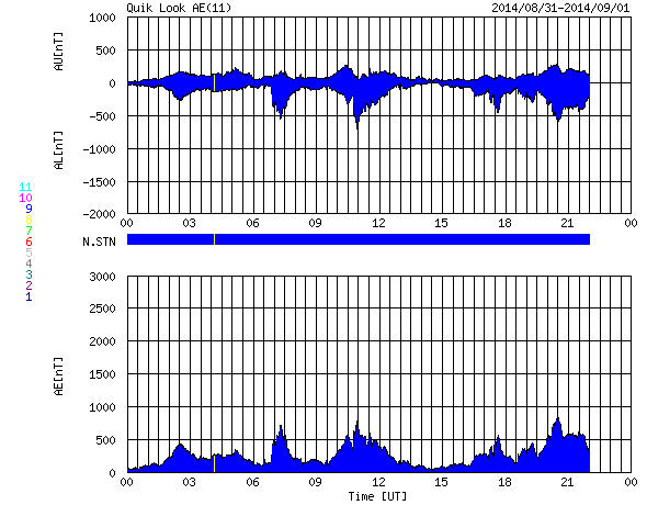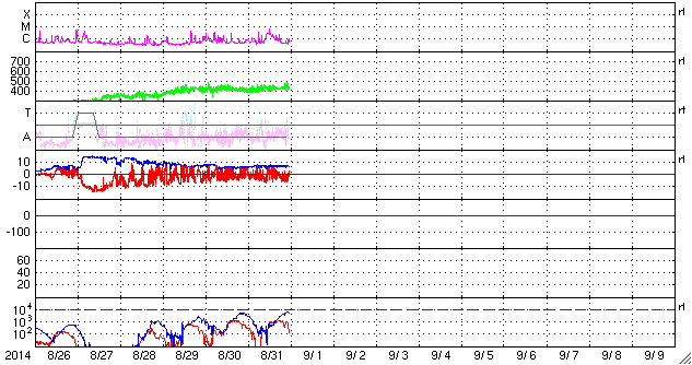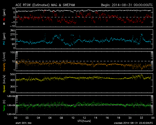 2014/ 9/ 1 08:42 更新 太陽風は400km/秒付近で安定し、磁気圏の活動も続いています。 担当 篠原 太陽風の速度は、400km/秒から430km/秒へ 少し高まっている様です。 27日周期の図を見ると、 前周期の太陽風の速度は、 8月2日に弱い高まりが来た後、少し落ち着いて、 5日にもうひとつの高まりが到来していました。 今回は、速度が変わらないまま、 2番目の山に入っていった様に見えます。 前周期は500km/秒近くまで速度が上がっています。 今回ももう少し速度が高まるかもしれません。 太陽風の磁場強度は、 7nTと少し高い値で安定しています。 南北成分は、南を向いたり、北を向いたりと変化していて、 AE指数は、700nTくらいの中規模の変化が 何度も発生しています。 27日周期の図を参考にすると、 明日くらいから磁場強度は下がって行くかもしれません。 その場合、磁気圏の活動の高まりも もう2日程度かもしれません。 太陽では、昨夜、31日21時(世界時31日12時)に、 西の端近く(右端)の2149黒点群でC7.1と やや大きい小規模フレアが発生しました。 2149群はCクラスの活動が続いていましたが、 昨日のニュース以降、 C1.3、C3.4、C1.8、C3.6、C2.1、C2.2 などのフレアも起こしています。 このうち、C3.6のフレアは、 X線強度が長時間高まるタイプで、 GOES衛星のX線の図では、一番目立っています。 また、中央部南側の2152群は、 黒点が大きくなっています。 フレアの活動も高まるかどうか、注目して下さい。 ![]() SDO衛星のAIA193カメラによる太陽コロナの様子 (c) SDO (NASA) ![]() SDO衛星による太陽の可視光写真。マウスの矢印を写真に重ねると、黒点番号付きの写真に切り替わります。 (c) SDO (NASA) ![]() ACEが観測した太陽風の磁場(1番上の枠、白線は全体の強度、赤線は南北成分) および、太陽風の密度(3番目の橙線)、速度(4番目の黄線) (c) NOAA/SWPC ![]() リアルタイムAE指数 下段のAEグラフの値が高くなると、オーロラ活動が活発化しています。 (c) 京都大学, NICT ![]() 27日の太陽周期に合わせたデータプロット 太陽が同じ面を地球に向けていた27日前の変化から、今後を予想することができます。 (c) 作図:宇宙天気ニュース