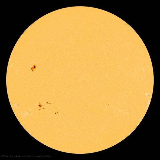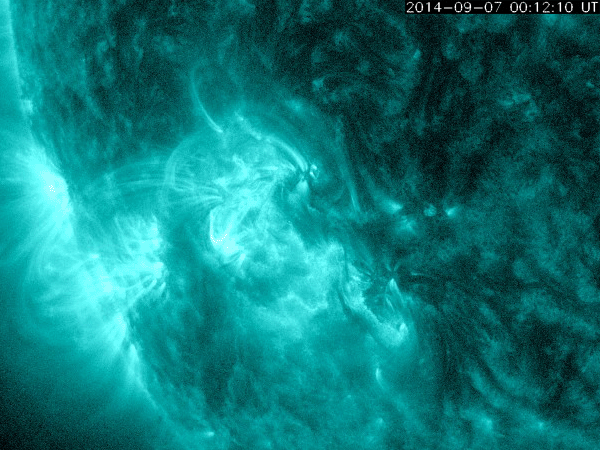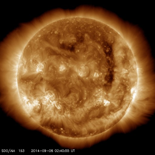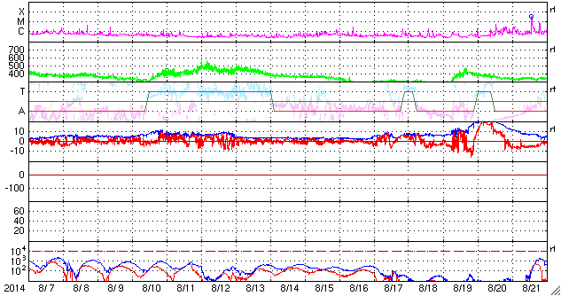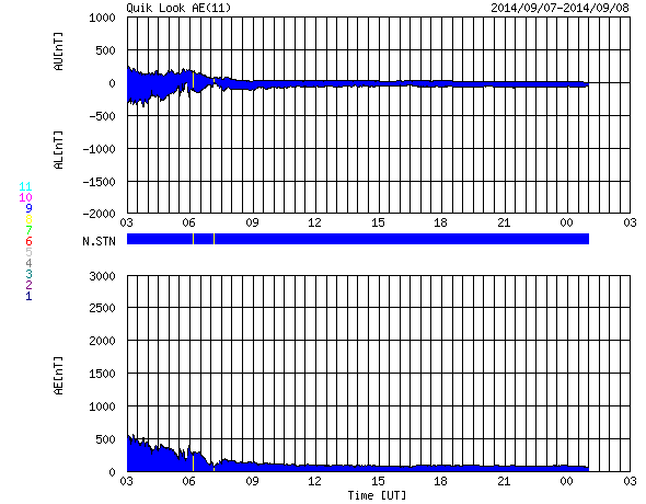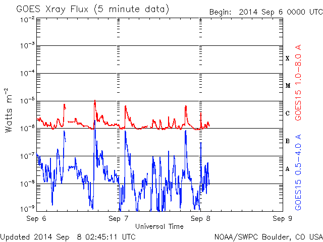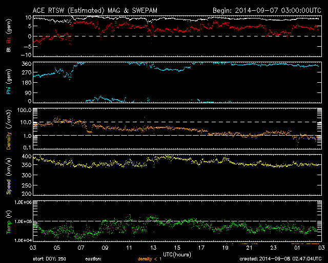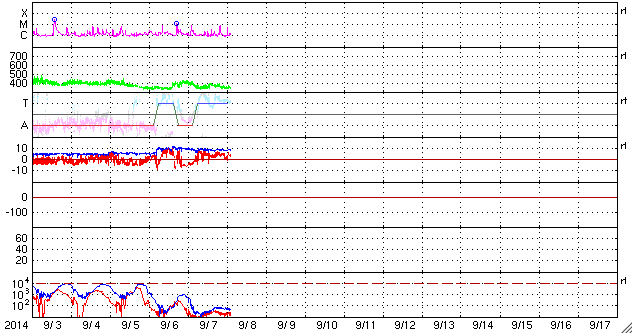 2014/ 9/ 8 11:47 更新 2157黒点群でCクラスのフレアが続いています。太陽風は低速に戻りました。 担当 篠原 太陽の南東部の2157黒点群の活動が続いています。 昨日より、C2.2,C1.9、C2.2、C3.3と Cクラスのフレアを起こし続け、 今朝、8日4時半(世界時7日19時半)には、 C7.8と一段大きいCクラスフレアを起こし、 その後もC5.1を起こしています。 また、左隣の2159黒点群も、昨日のニュースの頃に C7.5の小規模フレアを起こしています。 これらの領域の活動の様子を、 SDO衛星AIA131の動画で紹介します。 フレアの輝きが次々と起きています。 2157黒点群は、黒点が更に増えています。 引き続き注目して下さい。 太陽風は、昨日のニュースの後、 すぐに速度が低下して、350km/秒と低速風になっています。 27日前の前周期の変化から、 速度の高まりは3〜4日くらい続くかと思いましたが、 今回は様子が変わっている様です。 一方、磁場強度は8nTとまだ高まった状態が続いています。 このため、速度の変化にももうしばらく注目して下さい。 磁場の南北成分は、昨日の昼過ぎに北向きに変わり、 以降、そのまま安定しています。 このため、磁気圏の活動も静かになっていて、 AE指数は最初に山が見えていますが、 以降はほとんど変化がありません。 太陽風がこのまま落ち着くと、 磁気圏も静かな状態が続くでしょう。