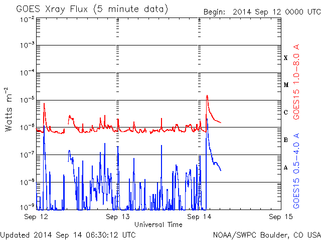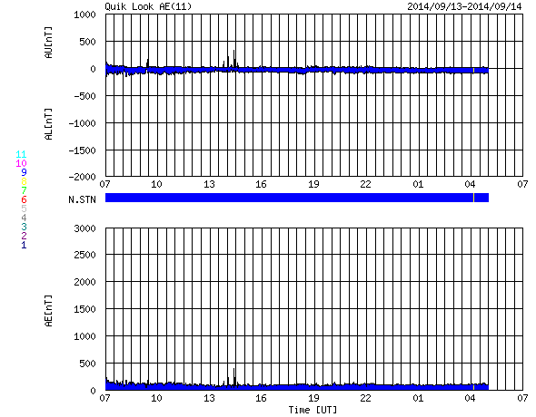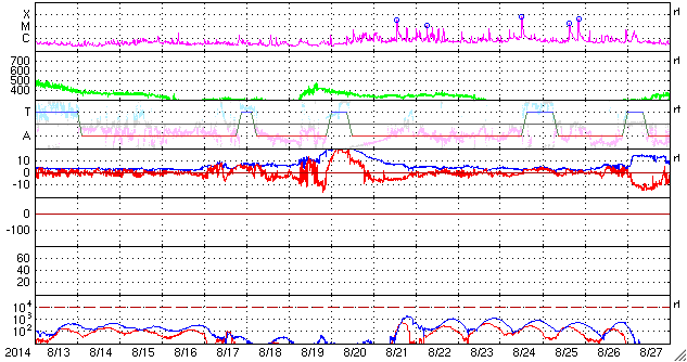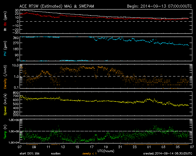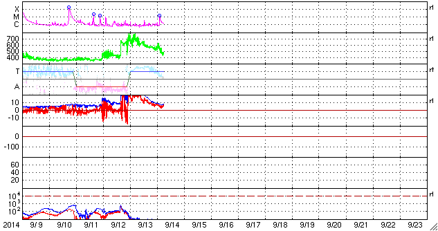 - 2014/ 9/12 11:34 今朝、CMEによる太陽風の乱れが到来しました。今夜くらいに次の乱れが到来しそうです。
