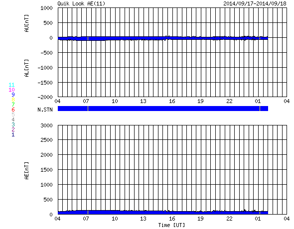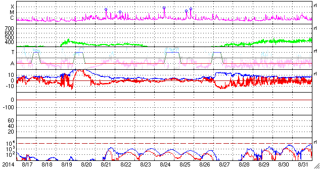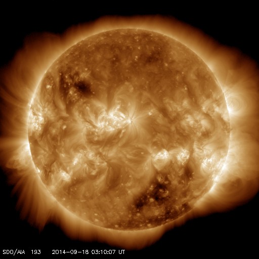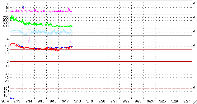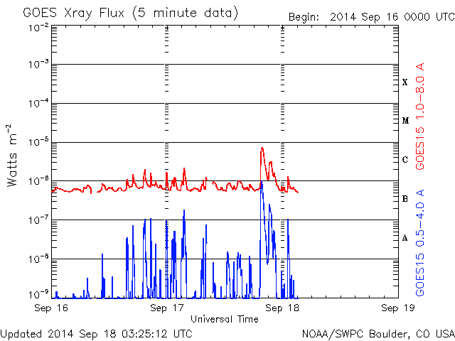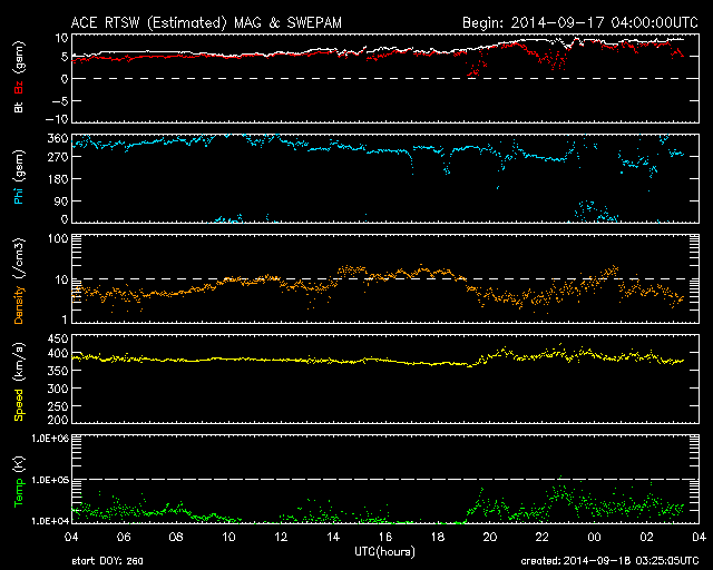 2014/ 9/18 12:26 更新 太陽風はやや低速ですが、磁場強度が少し上がっています。ムルマンスクのオーロラをどうぞ。 担当 篠原 ロシア、ムルマンスクの福島さんより、 オーロラの便りが届きました。 初めの2枚は、12日から13日にかけてやってきた X1.6フレアの太陽風の乱れによって発生したオーロラの写真です。 1枚目は、モンチェゴルスク市在住の I・マトヴェーエフ氏によるもので、 街の上空でオーロラの光が渦を巻くように輝いています。 この日は、ムルマンスクの多くの写真家たちが撮影に繰り出したそうで、 福島さんによると、かなりたくさんの写真が公開されているそうです。 その中で、ここでも度々オーロラ写真を掲載させていただいている V・ジガーノフ氏による動画がYoutubeに 公開されているとのことです。 1000枚以上の写真を加工したとのことで、 静止画とは全然違う、雰囲気のある作品になっています。 2枚目の写真は、北緯50度とオーロラ帯よりもだいぶ緯度の低い ウクライナ東部ハリコフ市で撮影されたオーロラです。 写真の左上に磁気圏の活動度を示す Kp指数のグラフが重ねられていますが、 これによると、擾乱が最も激しくなったころの撮影の様です。 オーロラの活動が低い緯度域まで広がっていたことが分かります。 3枚目の写真は、16〜17日にアパチット市で、 Y・ヤシェンコ氏による撮影です。 これはカメラの写り方にもよるのだと思いますが、 オーロラの深みのある緑色が印象的です。 素敵な写真をどうもありがとうございます。 動画の中で、人の動く姿や、走る車のヘッドライトを見ていると、 オーロラの時間軸を感じることができて、 たいへん興味深いです。 現在の太陽風は、速度は370km/秒とやや低速ですが、 磁場強度が、5nTから9nTへ少し強まっています。 太陽の南半球に広がるコロナホールの影響が、 及び始めているのかもしれません。 今後、速度も上昇を始めるかもしれないので、注目して下さい。 磁場の南北成分は、北向きの状態が続いています。 このため磁気圏は静穏で、AE指数は変化がありません。 太陽は、西の端(右端)で、 C7.5とC3.5の小規模フレアが発生しています。 GOES衛星のX線写真による動画を掲載します。 没していった2158群などによるフレアでしょう。 こちら側の黒点群では、 2164群でC1〜2などの小さいフレアが発生しています。