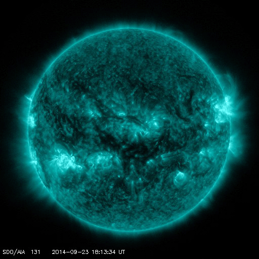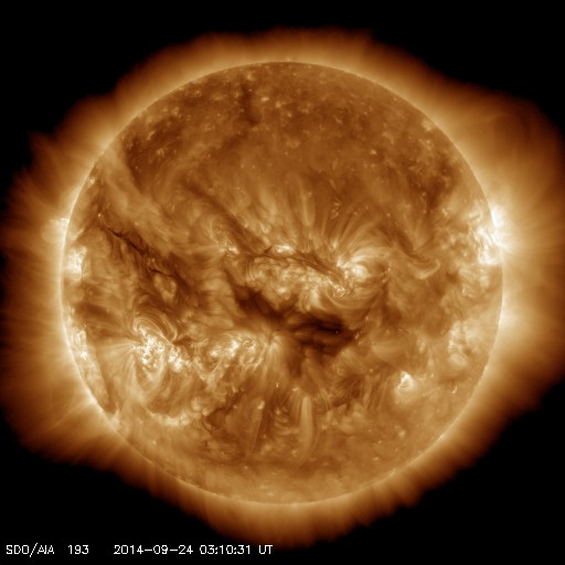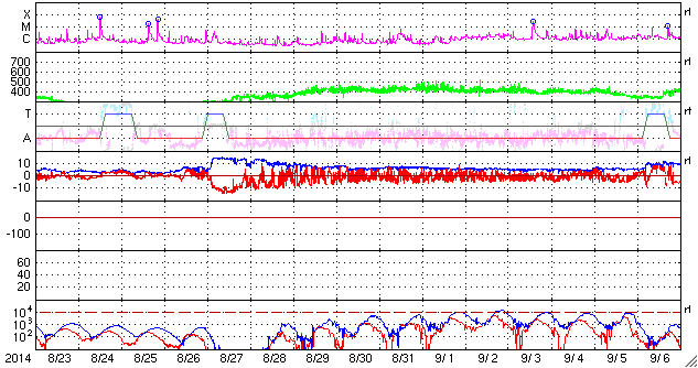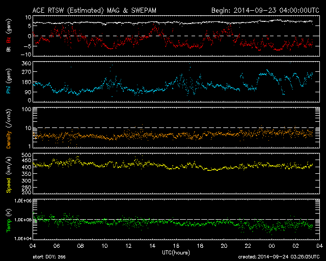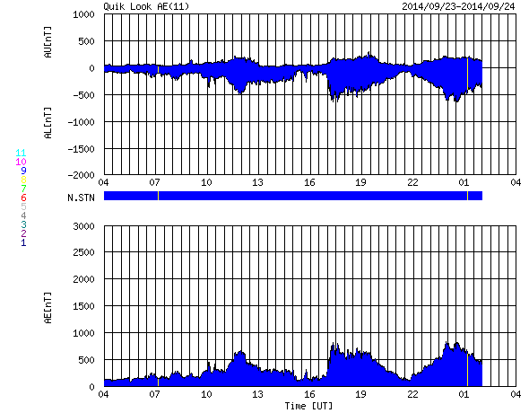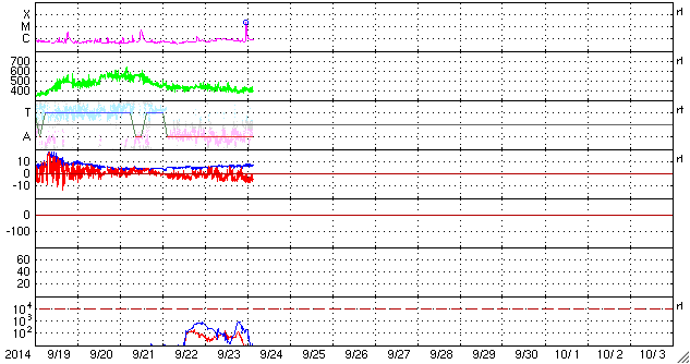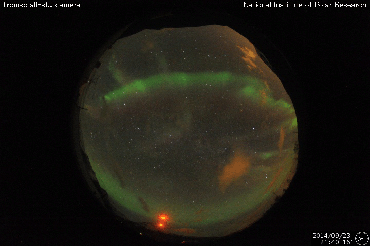 2014/ 9/24 12:26 更新 太陽風磁場が南向きになり、オーロラが活発になっています。イエローナイフのオーロラをどうぞ。 担当 篠原 今日もカナダ、イエローナイフのオーロラを紹介します。 一日遅れの掲載になってしまいましたが、 高坂雄一さんにより、現地21〜22日の夜に撮影された写真です。 この日も雲のすき間に当たったときに、 ちょうどきれいなオーロラが見られたとのことで、 頭上からオーロラの筋が降り注ぐ様子がとてもきれいです。 2、3枚目の写真では、中央の少し右下に アンドロメダ大星雲がオーロラと重なって見えています。 横に細長く滲んだように伸びている天体です。 また、写真の右上から左下に向かって、 淡い秋の天の川も写っています。 1枚目のバスとの写真も、現地の雰囲気が伝わってきて、 個人的には好きな写真です。 素敵な写真たちをありがとうございました。 太陽風は、やや高速の状態から少しだけ速度が下がり、 400km/秒と平均的な速度です。 磁場強度は、7nTにやや強まっていますが、 磁場の南北成分が南向きに振れる様になり、 -5nTを超えるまとまった変化が繰り返到来しています。 このため、磁気圏の活動も高まっていて、 AE指数では、700〜800nTの中規模の変化が、 数時間おきに繰り返し発生しています。 このグラフでは、最後の山の始まりにあたる、 世界時23日22時のノルウェー・トロムソのオーロラを、 全天カメラの動画で紹介します。 この後、太陽風は速度の高まりが 回帰してくる可能性があります。 現在の磁場強度の高まりは、 その変化と関係しているのかもしれません。 太陽では、東側の2172黒点群で、 今朝、24日8時(世界時23日23時)に、 M2.3の中規模フレアが発生しました。 SDO衛星AIA131による動画を掲載します。 2172群は、黒点としても大きく、 可視光写真ではだいぶ目立っています。 今後の活動に注目して下さい。 また、SOHO衛星LASCO C3では、 太陽を囲むように広がるハロー型のCMEが 2回見えています。 昨日と同様に太陽の裏側の現象で、 裏側の黒点では活発な活動が続いている様です。