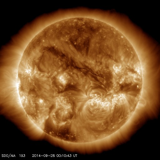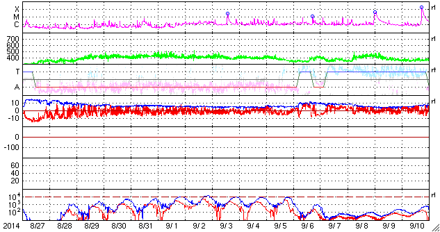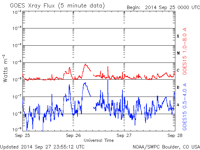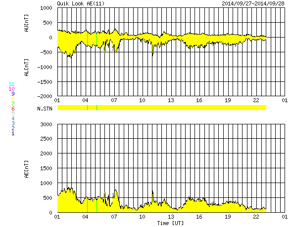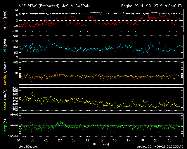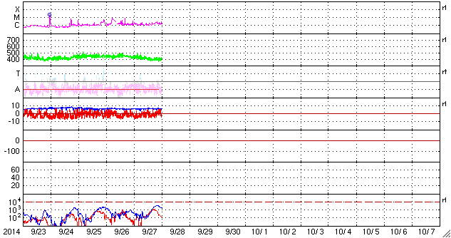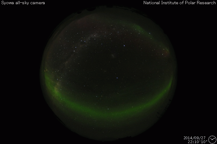 2014/ 9/28 09:30 更新 太陽風は平均的な速度に下がっています。M1の中規模フレアが発生しました。 担当 篠原 太陽風の速度は、440km/秒から400km/秒へ少し下がっています。 磁場強度も、小さい変化ですが、 6nTから5nTに下がっている様です。 今回の太陽風の弱い高まりは、 この辺りで終わるのか、また盛り返すのか、 引き続き注目して下さい。 太陽風磁場の南北成分は、南寄りの傾向が続いていましたが、 振れ幅は次第に小さくなり、 今朝くらいからは0nTを挟んだ変化になっています。 このため、磁気圏の活動も次第に規模が小さくなっていて、 AE指数のグラフは、初めに800nTの変化がありますが、 その後、500nTくらいになり、最後は小幅になっています。 太陽風磁場の南寄りの傾向が終わると、 この後は、オーロラの活動も弱まります。 AE指数のグラフの最後の頃にあたるオーロラの様子を、 南極昭和基地の全天カメラの動画で紹介します。 昭和基地のオーロラ写真も、例年通りなら残り2週間ほどです。 太陽では、GOES衛星X線のデータが欠けていて、 グラフには見えていませんが、 27日17時半(世界時27日8時半)に、 東端でM1.0の中規模フレアが発生しています。 可視光写真では、新しい黒点が顔を出しています。 また、2173黒点群で、C2.2、C2.4、 2172群でC2.2、C2.7の小規模フレアが起きています。 2172、2173、2175の黒点群は、大きな姿が目立っています。 この後もフレアの発生が続きそうです。