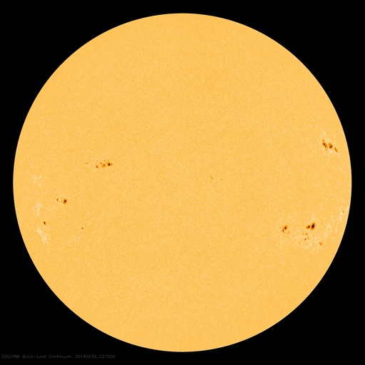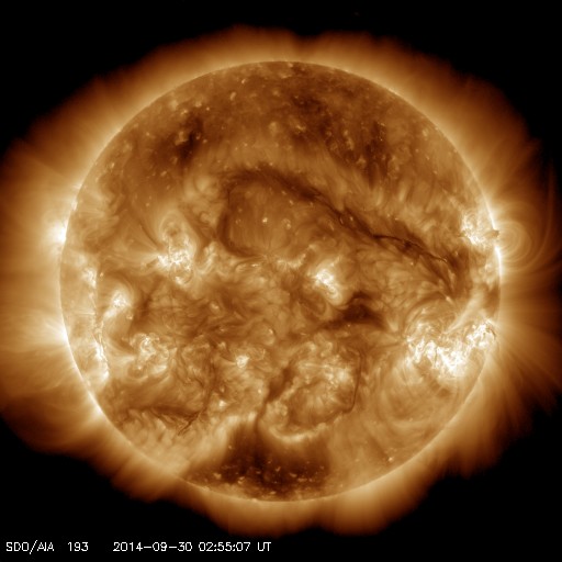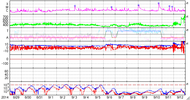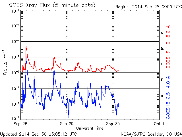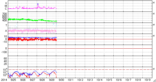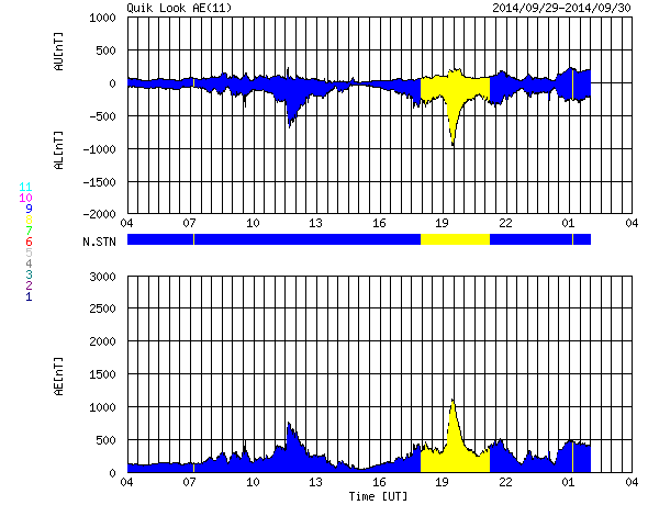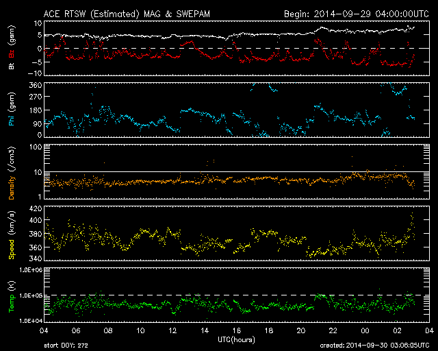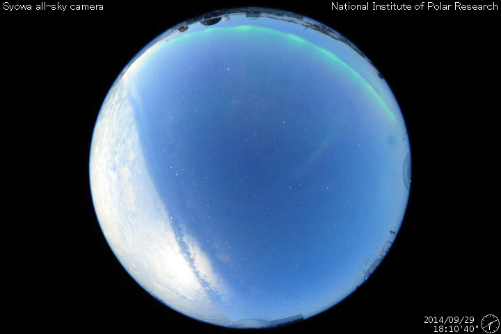 2014/ 9/30 12:06 更新 太陽風磁場が南寄りになり、オーロラが強まっています。 担当 篠原 太陽風は、370km/秒とやや低速の状態が続いていますが、 磁場の南北成分が南向きに振れる様になり、 -4nT程度の南向きが続いています。 このため、磁気圏の活動は再び高まって、 AE指数には、800nTや1100nTの大きな変化が記録されています。 この2つめの山にあたる、30日4時(世界時29日19時)頃の 南極昭和基地のオーロラの様子を紹介します。 ちょうど夕暮れの頃で、明るさの残る空が暗くなるとともに、 オーロラが、南(高緯度側)の低い空から頭の上に移動して、 やがて激しく空全体に広がっています。 ACEのグラフの最後では、 太陽風磁場の強度が6nTに少し上がり、 南向き成分も-5nTに少し強まっています。 オーロラの活発な活動は、この後も続く可能性があります。 太陽では、Cクラスの小規模フレアが続いています。 東の2177群のC5.4を最高に、 2173群でC2.1、C2.2、C3.3、2176群でC2.2、 などが起きています。 一方、2172、2173黒点群は次第に小さくなっています。