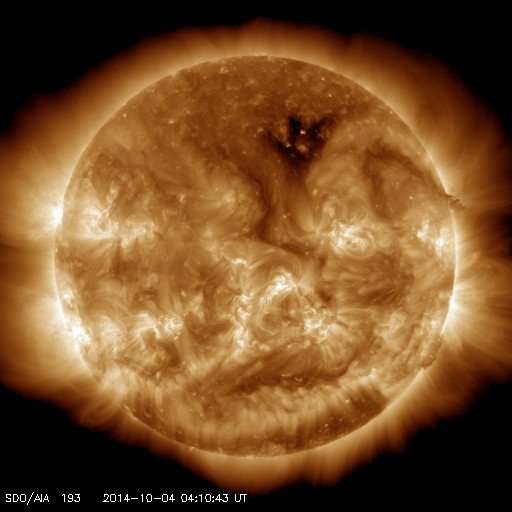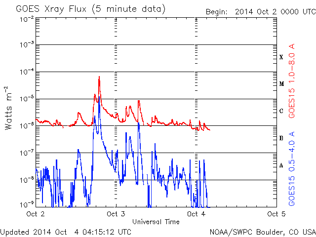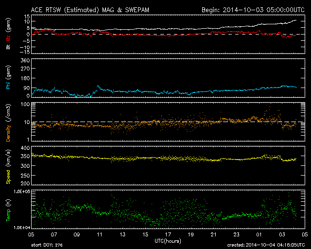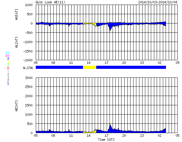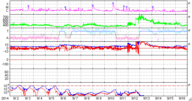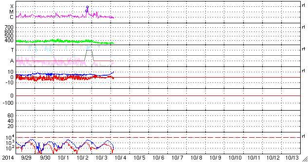2014/10/ 4 13:16 更新 太陽は穏やかです。太陽風は低速ですが、磁場強度が高まっています。 担当 篠原 昨日のMクラスフレアの後も、 西の端の2173群ではフレアの発生が続き、 C5.7、C9.0など大きめのCクラスフレアを起こしています。 また、となりに並んでいた2172群でも、 C5.7を最大に、C3.2、C2.5などのCクラスフレアが起きています。 現在は、活動的だったこれらの領域は沈んで見えなくなり、 残った2181群でC2.2、2178群でC1.7の Cクラスフレアが起きた程度です。 太陽には、小さい黒点があちこちにあって、 黒点群の数は多くなっていますが、 活動は落ち着いています。 太陽風は、速度は350km/秒と低速になり、 磁場強度も4nTくらいに下がっていましたが、 今朝から変化が始まり、磁場強度が10nTに強まっています。 今のところ、太陽風の速度は330km/秒へ更に下がっていますが、 磁場強度とともに、今後の変化に注目して下さい。 磁場の南北成分は、0nTの付近で安定しています。 磁気圏は静穏で、AE指数は途中にひとつ、 400nTの高まりが発生している程度です。 霧島市は、台風18合の影響で東の風が強くなっています。 今のところ台風の直撃は避けられそうですが、 明日の午後にかけて、更に風が強まりそうです。