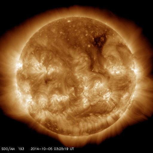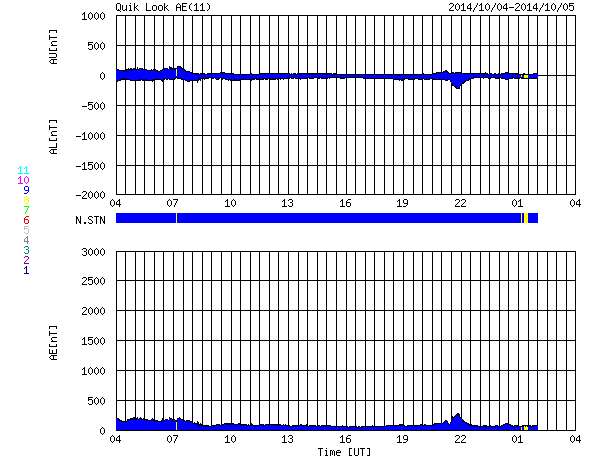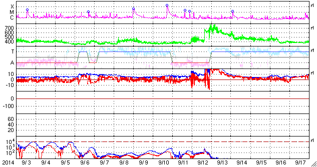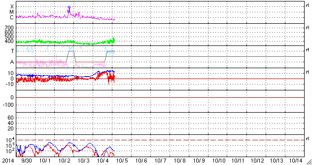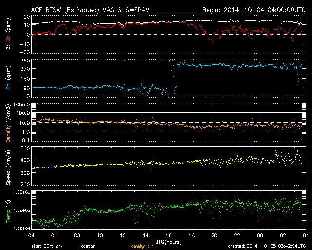 2014/10/ 5 12:43 更新 太陽風の磁場が強まっています。太陽は穏やかです。 担当 篠原 太陽風磁場の強まりが続いています。 昨日のニュース以降も、10〜15nTの範囲で推移し、 今朝くらいから少し弱まりつつあるのか、 現在は10nTくらいです。 一方、速度は350km/秒の低速状態からゆっくりと上がり、 現在は400〜450km/秒と平均的な速さに上がっています。 更に上昇を続けるのかどうか、注目して下さい。 太陽風磁場の南北成分は、 昨夜までは北向きに強まっていましたが、 今日に入った頃から0nT付近で変化する様に変わっています。 磁気圏の活動は穏やかで、 AE指数に目立った変化はありません。 太陽は、2173群、2172群が没するとともに X線の強度も下がり、穏やかになっています。 2178群と2177群で、 C1の小さいフレアが4回起きている程度です。 東端でも活動的な様子は見られず、 太陽はしばらく穏やかになりそうです。 台風18号が接近していますが、 台風との位置関係のおかげか、 風は強まっていますが、時折激しくなる程度です。 今日、明日とどうぞ十分ご注意下さい。