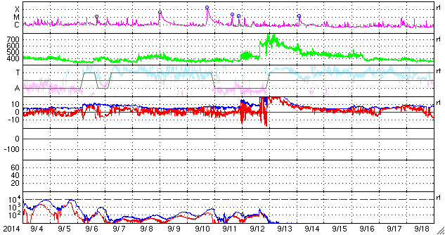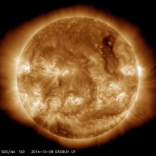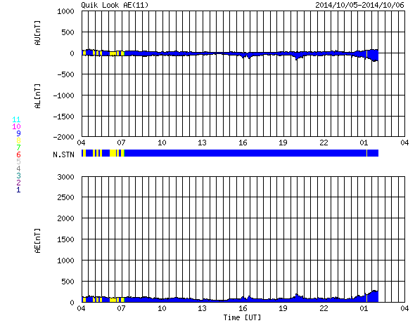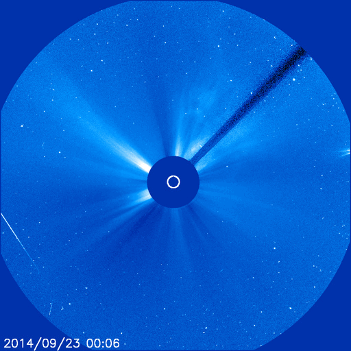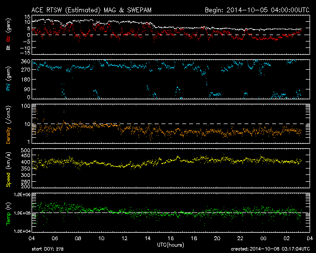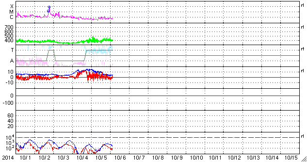 2014/10/ 6 12:17 更新 太陽風は平均的な状態で、磁気圏も穏やかです。 担当 篠原 宇宙天気の話題ではありませんが、 先月末より、SOHO衛星LASCO C3カメラの右側に、 金星が明るい姿を現しています。 次第に太陽に近づく様子を、動画で紹介します。 金星は太陽の向こう側を通過しているところです。 今月26日頃に太陽に一番近づいて、 その後左側へ通り抜けていきます。 太陽風磁場の強まりは、昨日いっぱいで終わり、 現在は5nTと平均的な強度に戻っています。 速度も400km秒と平均的な速さで、 太陽風は穏やかです。 太陽風磁場の南北成分は、 0nT付近で小さく変化しています。 磁気圏は静穏で、AE指数には目立った変化はありません。 SDO衛星AIA193の北半球側に見えていた コロナホール(周囲よりも薄暗く見える領域)は、 中心線を通り過ぎて、西側(右側)に動いています。 この領域からの影響が来るとすると、そろそろだと思います。 太陽風に弱い高まりが見られるかもしれません。 太陽は、C1の小さいフレアが4カ所で発生していますが、 活動の目立つ領域はなく、穏やかです。 ![]() 太陽の向こう側を金星が通過しつつあります。SOHO衛星LASCO C3。 (c) SOHO (ESA & NASA)、動画作成 : 宇宙天気ニュース ![]() SDO衛星のAIA193カメラによる太陽コロナの様子 (c) SDO (NASA) ![]() SDO衛星による太陽の可視光写真。マウスの矢印を写真に重ねると、黒点番号付きの写真に切り替わります。 (c) SDO (NASA) ![]() ACEが観測した太陽風の磁場(1番上の枠、白線は全体の強度、赤線は南北成分) および、太陽風の密度(3番目の橙線)、速度(4番目の黄線) (c) NOAA/SWPC ![]() リアルタイムAE指数 下段のAEグラフの値が高くなると、オーロラ活動が活発化しています。 (c) 京都大学, NICT ![]() 27日の太陽周期に合わせたデータプロット 太陽が同じ面を地球に向けていた27日前の変化から、今後を予想することができます。 (c) 作図:宇宙天気ニュース