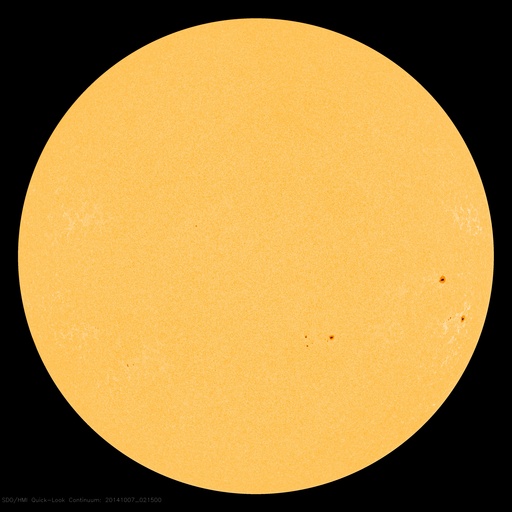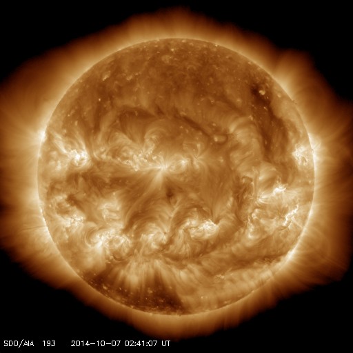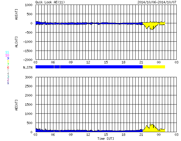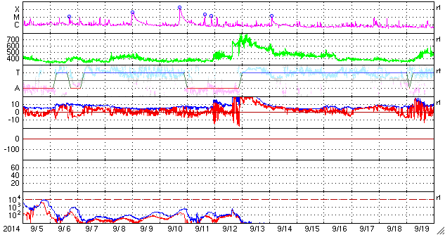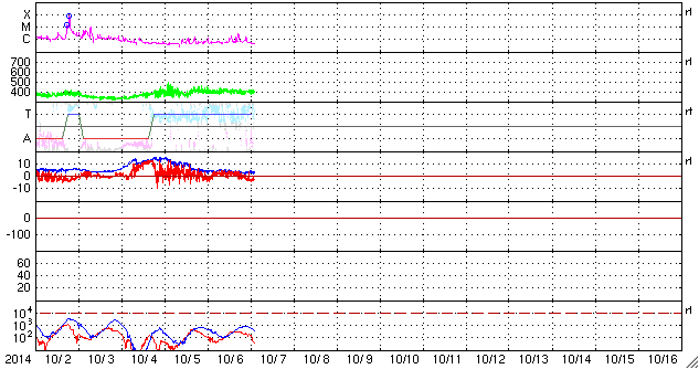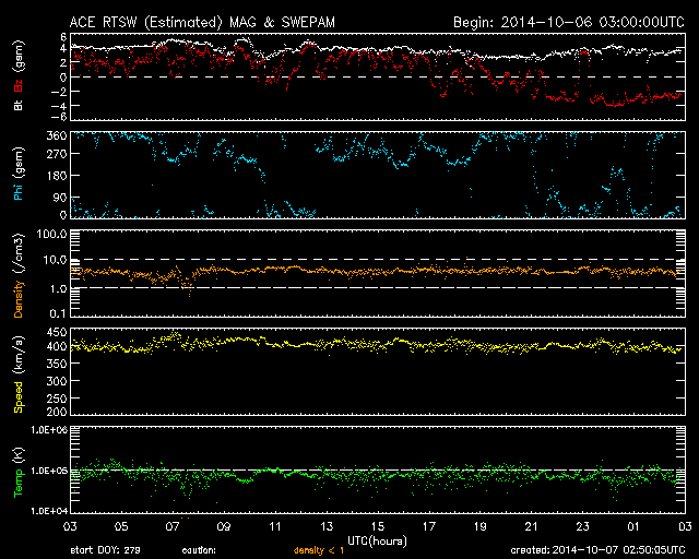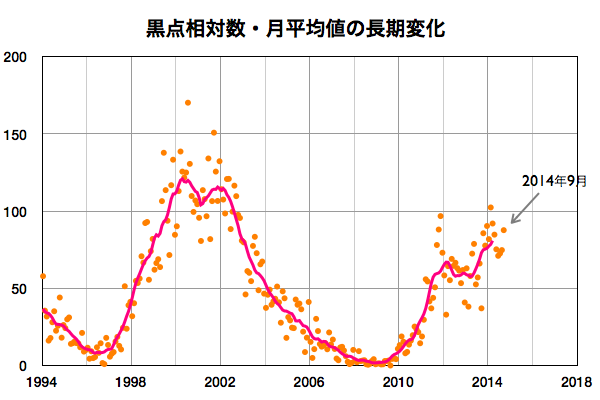 2014/10/ 7 11:50 更新 太陽風は平均的な速度です。太陽も穏やかです。9月の黒点数は87.6でした。 担当 篠原 掲載が遅くなりましたが、WDC-SILSOより、 2014年9月の黒点相対数が発表されています。 87.6 と5ヶ月ぶりに80台に上がりました。 20年間の長期変化の図を掲載します。 この4ヶ月は、一段下がったところに点が集まっていましたが、 9月は久しぶりに高まっています。 こうして増減しながら極小に向かっていくのでしょう。 また、明日の夜はいよいよ3年ぶりの皆既月食です。 国立天文台に詳しい紹介があります。 鹿児島の天気予報は、肝心の夕方に雲マークが出ていて、 ちょっと心配になっています。 前回(記事)が雨混じりの観望だったので、 今回こそと期待しています。 現在の太陽風は、 速度は400km/秒と平均的な速さで安定しています。 磁場強度は4nTから3nTに弱まり気味です。 今朝、7日6時(世界時6日21時)頃から 磁場が南寄りに変わり、 -3nTくらいの弱い南向きが続いています。 このため、磁気圏の活動もやや高まって、 AE指数のグラフは、中盤までは静かでしたが、 最後に400nTくらいの小さい変化が発生しています。 太陽では、南西(右下)の2181黒点群で C1の小さいフレアが2回、 南東(左下)に新しく現れた2185黒点群で C3.0の小規模フレアが発生しています。 この後も、小さい活動が見られる程度でしょう。 ![]() 太陽黒点相対数の長期変化。 (c) 黒点データ:WDC-SILSO、作図:宇宙天気ニュース ![]() SDO衛星のAIA193カメラによる太陽コロナの様子 (c) SDO (NASA) ![]() SDO衛星による太陽の可視光写真。マウスの矢印を写真に重ねると、黒点番号付きの写真に切り替わります。 (c) SDO (NASA) ![]() ACEが観測した太陽風の磁場(1番上の枠、白線は全体の強度、赤線は南北成分) および、太陽風の密度(3番目の橙線)、速度(4番目の黄線) (c) NOAA/SWPC ![]() リアルタイムAE指数 下段のAEグラフの値が高くなると、オーロラ活動が活発化しています。 (c) 京都大学, NICT ![]() 27日の太陽周期に合わせたデータプロット 太陽が同じ面を地球に向けていた27日前の変化から、今後を予想することができます。 (c) 作図:宇宙天気ニュース