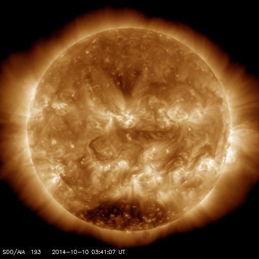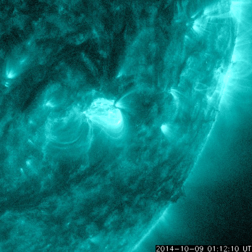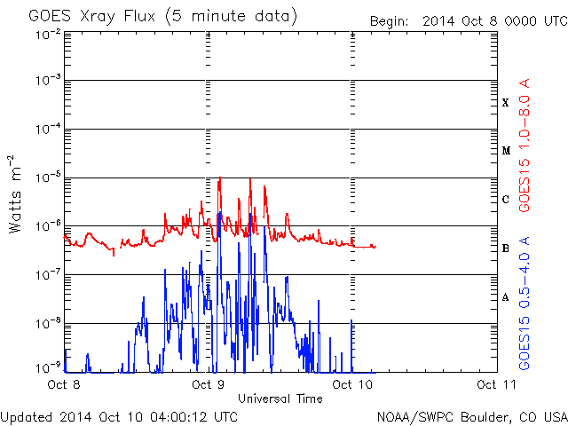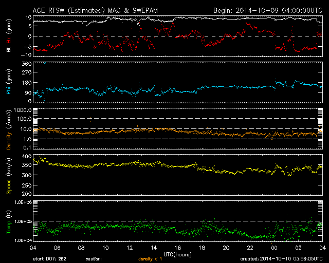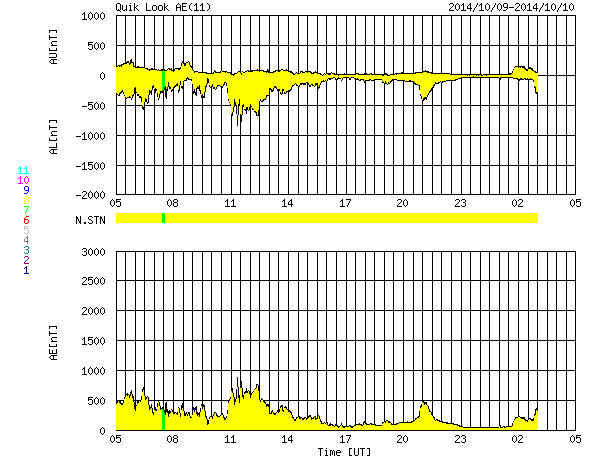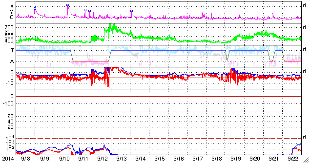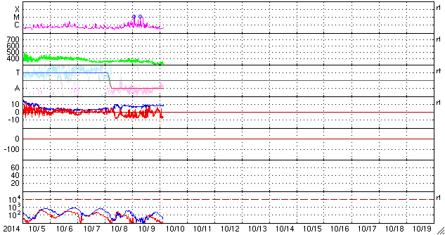 2014/10/10 13:00 更新 2182黒点群でフレアの発生が続きました。太陽風磁場の影響で磁気圏活動はやや高まっています。 担当 篠原 太陽の南西(右下)の2182黒点群は、 その後も活発に活動を続け、 9日16時(世界時9日7時)にM1.2の中規模フレア、 その前後に、C7.9、C4.2、および、 C1〜2の小規模フレアを7回ほど起こしました。 活発な活動の様子を、 SDO衛星AIA131の動画で紹介します。 しかし、2182群は今日に入った頃から静かになり、 フレアの発生は止まっています。 GOES衛星のX線グラフは、変化がなくなっています。 太陽面で目立つ黒点は2182群と、 南東の2186群だけになり、 少し寂しくなっています。 太陽風は、速度が370km/秒から330km/秒に下がり、 より低速の風に変わっています。 磁場強度は、8nTにやや強まった状態が続いていて、 磁場の南北成分は、 頻繁に -5nTくらいの南向きに変化しています。 このため、磁気圏の活動もやや高まった状態が続き、 AE指数は、500nT前後の変化が続いています。 ただし、太陽風の速度がより下がってきたことや、 今後、磁場の強まりが弱まると考えると、 磁気圏の変化は次第に小さくなっていくでしょう。 台風19号は、13日(月)頃に九州直撃になりそうな予報です。 今日はかなり強い東風が吹き続けています。 この様子だと、月曜まで3連休のため、 今日の夕方に高専内のLANは停止することになりそうです。 ニュースの公開は臨時サーバーで続ける予定ですが、 フレア情報などのリアルタイムの更新はできなくなります。 申し訳ありませんが、ご了解下さい。
