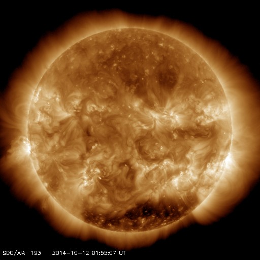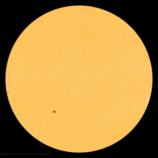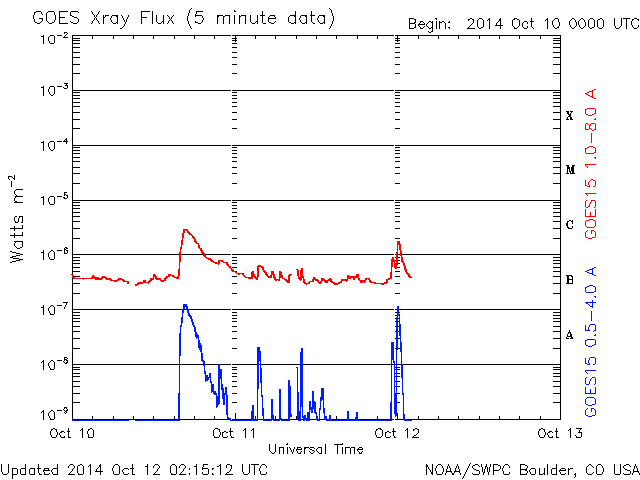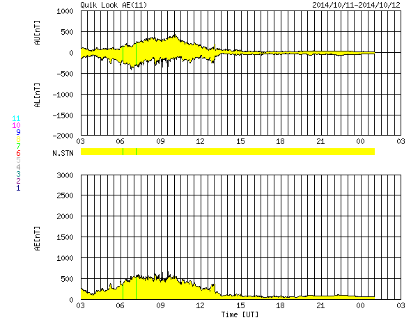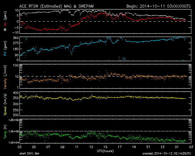 2014/10/12 12:00 更新 太陽風は低速で、磁気圏は穏やかです。皆既月食の写真をどうぞ。 担当 篠原 10月8日の皆既月食の夜は、 鹿児島は晴天で、 始まりから終わりまでじっくり見ることができました。 残念ながら学校の関係で、 始まりには少し出遅れてしまったのですが、 月食の全体を写真に撮ることができたので、 繋げて動画にしました。 皆既中の赤い色の移り変わりがとてもきれいで、 写真では残念ながら表現しきれないのですが、 雰囲気だけでもご覧下さい。 欠け始めの月が少しゆがんで、色も黄色いのは、 鹿児島ではまだ月の高度が低く、 大気の影響を強く受けていたためです。 また、今回の月食では、 月のすぐ近くに天王星が見えていました。 皆既中は双眼鏡でもすぐ見つけられ、 写真にも撮ることができたので紹介します。 また半年後の4月4日に皆既月食が見られます。 どうぞお楽しみに。 太陽は、東端から2187黒点群が現れました。 現れてすぐの、今朝、12日9時(世界時12日0時)頃に、 C1程度の小さいフレアを起こしました。 大きな黒点ではありませんが、 活動の様子など、この後の変化に注目して下さい。 太陽風は、速度は350km/秒と低速の状態が続いていますが、 磁場強度が一時的に10nTに高まる変化が起きています。 最も強まっていたのは、 昨夜、11日18時(世界時11日9時)から 12日0時(世界時11日15時)にかけてで、 その頃に、磁場の南北成分は -7nTくらいの南向きに振れています。 磁気圏の活動もこの頃にある程度強まり、 AE指数は500nTの中規模の変化が起きています。 今朝くらいから磁場強度は次第に弱まり、 現在は2nTとむしろ弱くなっています。 磁場の南北成分は北向きに振れていて、 AE指数の変化は現在は見られなくなっています。 太陽風は、基本的には低速の穏やかな状態が続きそうです。 鹿児島は台風の影響がかなり強まってきました。 昨日はまだ風だけだったのですが、 今日は雨も降り始め、風雨ともに更に強まっています。 本当に近づくのははまだこれからなので、 明日まで注意しなければと思っています。