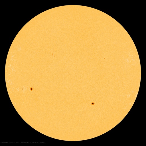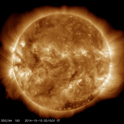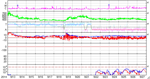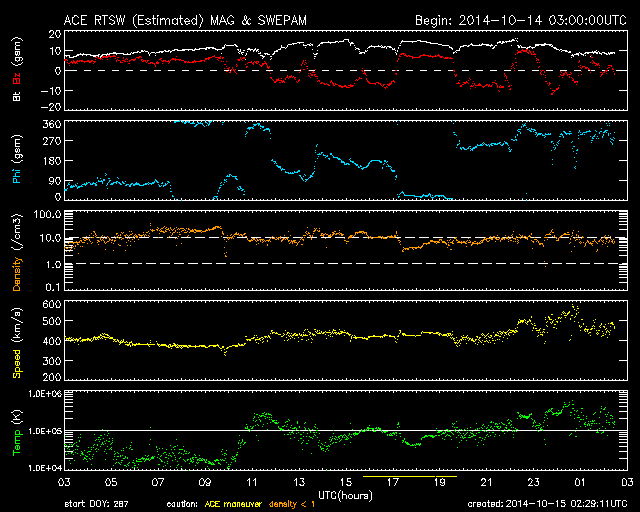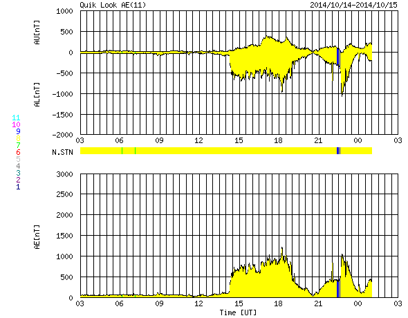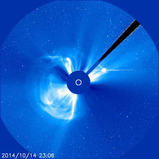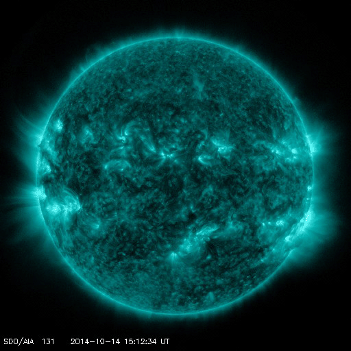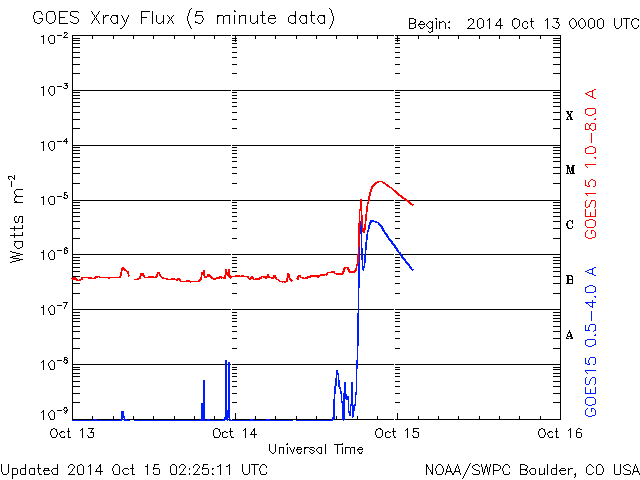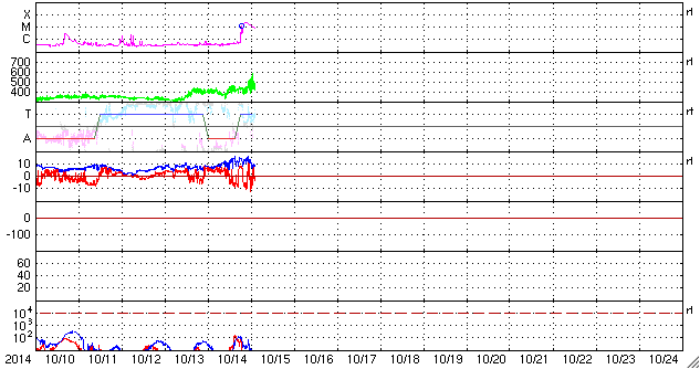 2014/10/15 11:29 更新 太陽の東端の向こう側でMクラスのフレアが発生し、CMEも噴出しています。 担当 篠原 今朝、太陽の東端の向こう側で、 規模の大きいフレアが発生しました。 GOES衛星のX線データでは、 15日3時半(世界時14日18時半)にM1.1の変化が発生し、 すぐに、よりゆっくりとしたX線強度の上昇が始まって、 15日6時半(世界時14日21時半)にM2.3に達する変化が発生しました。 SDO衛星AIA131による動画を掲載します。 発生地点は太陽の端の向こう側なので、 噴き上がった上の部分だけが見えています。 実際には更に規模の大きなフレアだったと思われます。 このフレアに伴って、CME(太陽ガスの放出現象)も発生しています。 発生直後であるため、SOHO衛星の写真が揃ってはいないのですが、 噴き上がる様子を動画で紹介します。 太陽の左に向かって、 半円を描くように白いガスが広がっています。 地球からは、真横の少し向こう側にあたるので、 影響は及びにくいと思いますが、 しばらく様子を見て下さい。 太陽の可視光写真では、 東端に黒点の姿はまだ見えていません。 今後どの様な領域が見えてくるのか、注目して下さい。 太陽は、この他の領域では特にフレアは発生していません。 太陽風は、少し強まった状態になっています。 速度は、400km/秒の平均的な状態から、 今朝になって450km/秒とやや高速に上がりかけています。 また、磁場強度は、10〜15nTに一段高まっています。 27日周期の図の前周期の、 9月19〜21日に見られた太陽風の高まりが、 1日半ほど早く回帰したのかもしれません。 その場合、速度の高まりは、 これから3日程度続く可能性があります。 太陽風磁場の南北成分は、南に振れたり、北に振れたり、 ゆっくりと変化しています。 磁場強度が高まっているため、振れ幅も大きくなっていて、 -5nTを超える変化になっています。 このため、磁気圏の活動も強まっていて、 AE指数では700nTから1000nTに達する変化が発生しています。 ノルウェー、トロムソの全天カメラでは、 活発なオーロラの様子が撮影されています。 太陽風の磁場が強まっている間は、 より活発な活動が起きやすので注目して下さい。