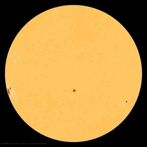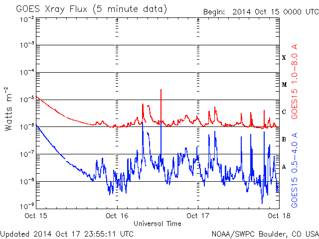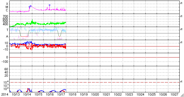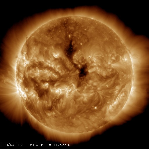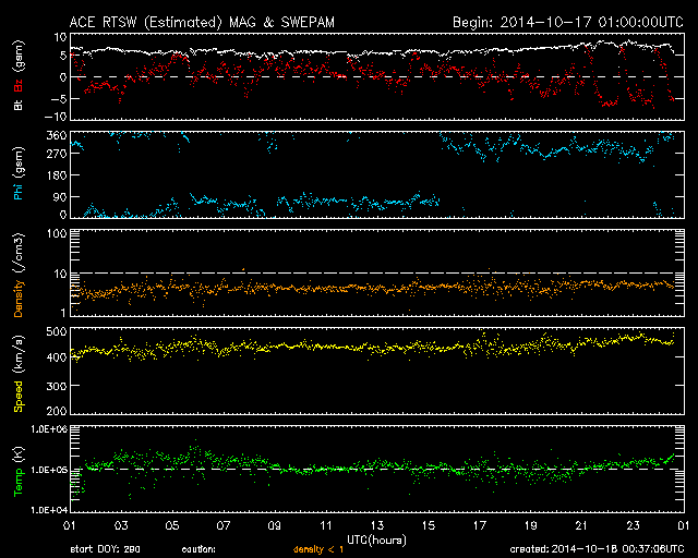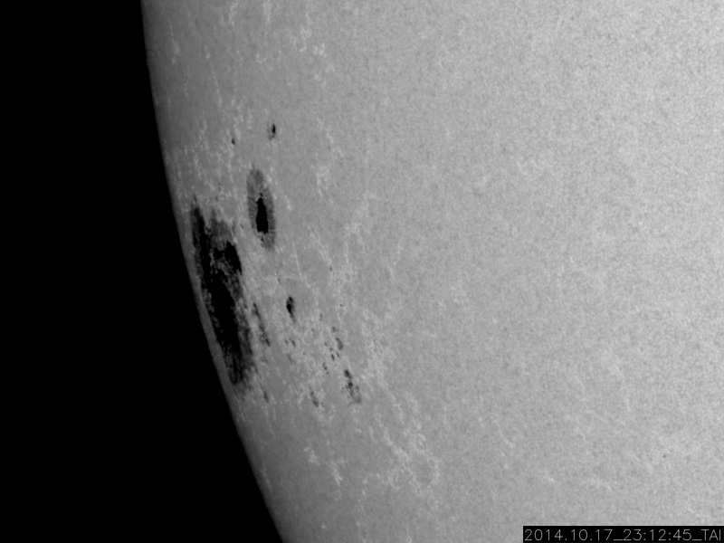 2014/10/18 09:37 更新 太陽の東端から2192黒点群が現れ、Cクラスのフレアを起こしています。 担当 篠原 太陽の東端から現れた黒点群は、 2192群と番号が付けられています。 拡大した様子を、SDO衛星の可視光写真で紹介します。 2192群は、昨日のニュース以降、 C3.9、C6.6、C6.7などの小規模フレアを起こしていて、 GOES衛星のX線グラフは頻繁に変化しています。 今後もフレアの発生が続きそうです。 太陽風は、 450km/秒に速度が少し上がり(ACEの図の黄色線)、 磁場強度(白線)も7〜8nTに少し強まっています。 目立つほどの変化ではありませんが、 27日周期の図の前周期を見ると、 9月22日以降に同じような太陽風が続いています。 今回も、まもなくセクターの切り替わりが到来して、 現状の様なやや強まった太陽風が続くのかもしれません。 一方、SDO衛星AIA193の太陽写真の中央には、 コロナホールが縦に細長く伸びています。 2〜3日後くらいには、 こちらの影響もやって来る可能性があります。 太陽風磁場の南北成分(ACEの赤線)は、 時々南に振れる(マイナスに振れる)様な変化をしています。 このため、磁気圏では断続的に小規模の活動が起きていて、 AE指数は、200〜500nTの変化が発生しています。 太陽風の速度や磁場がやや高まっているので、 磁場が南に振れると、 これまでより強まったオーロラの活動が見られるかもしれません。