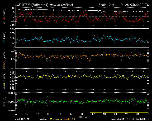 | 太陽風は速度、南向き磁場ともに静かです。 |