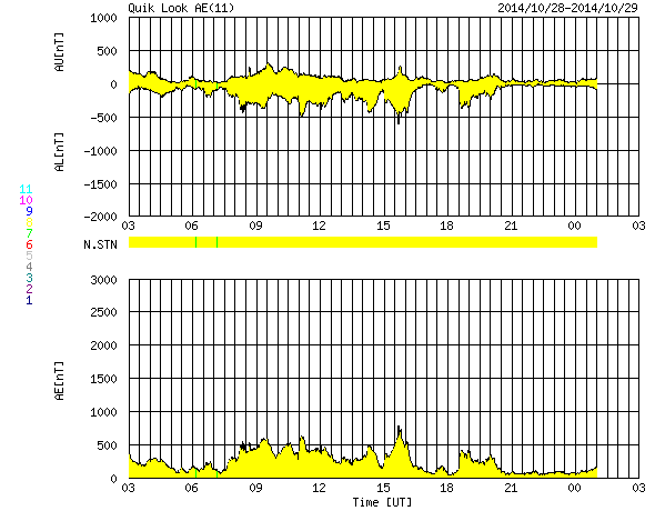 下段のAEグラフの値が高くなると、オーロラ活動が活発化しています。