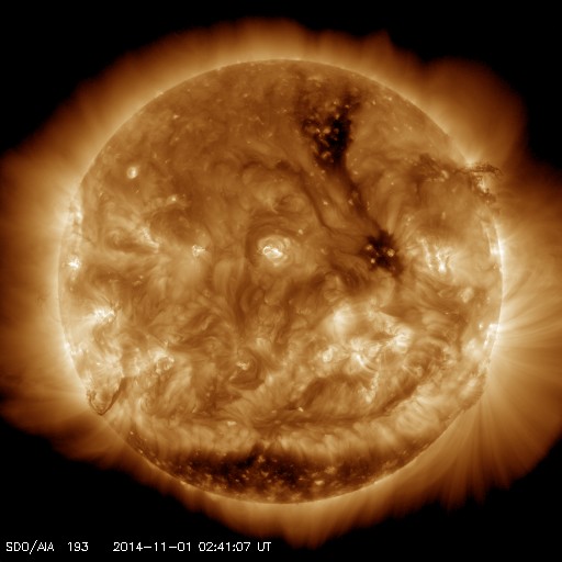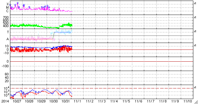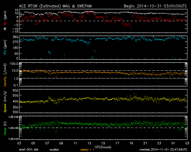 2014/10/31 12:08 2192黒点群は見えなくなりました。太陽風は磁場がやや強まっています。