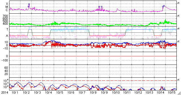 (c) SDO (NASA)、 (動画加工 : 宇宙天気ニュース) ![]() フィラメント噴出によるCMEの様子。SOHO衛星LASCO C3。 (c) SOHO (ESA & NASA)、 (動画加工 : 宇宙天気ニュース) ![]() SDO衛星のAIA193カメラによる太陽コロナの様子 (c) SDO (NASA) ![]() SDO衛星による太陽の可視光写真。マウスの矢印を写真に重ねると、黒点番号付きの写真に切り替わります。 (c) SDO (NASA) ![]() GOES衛星の太陽X線データ (c) NOAA/SWPC ![]() ACEが観測した太陽風の磁場(1番上の枠、白線は全体の強度、赤線は南北成分) および、太陽風の密度(3番目の橙線)、速度(4番目の黄線) (c) NOAA/SWPC ![]() リアルタイムAE指数 下段のAEグラフの値が高くなると、オーロラ活動が活発化しています。 (c) 京都大学, NICT ![]() 27日の太陽周期に合わせたデータプロット 太陽が同じ面を地球に向けていた27日前の変化から、今後を予想することができます。 (c) 作図:宇宙天気ニュース